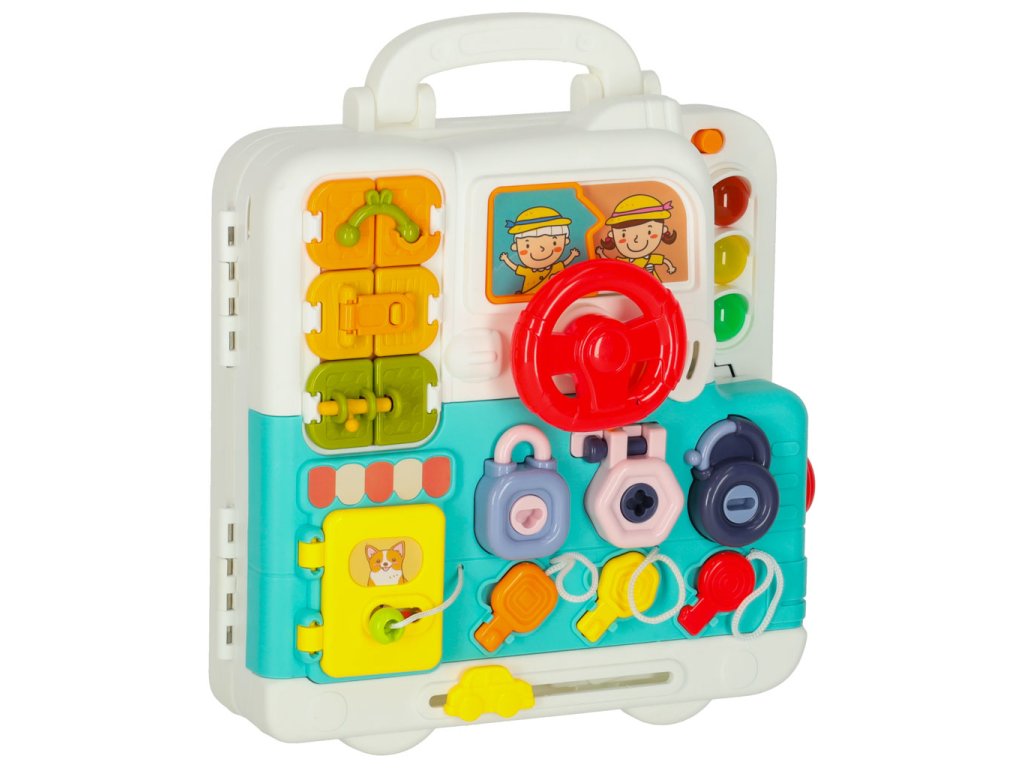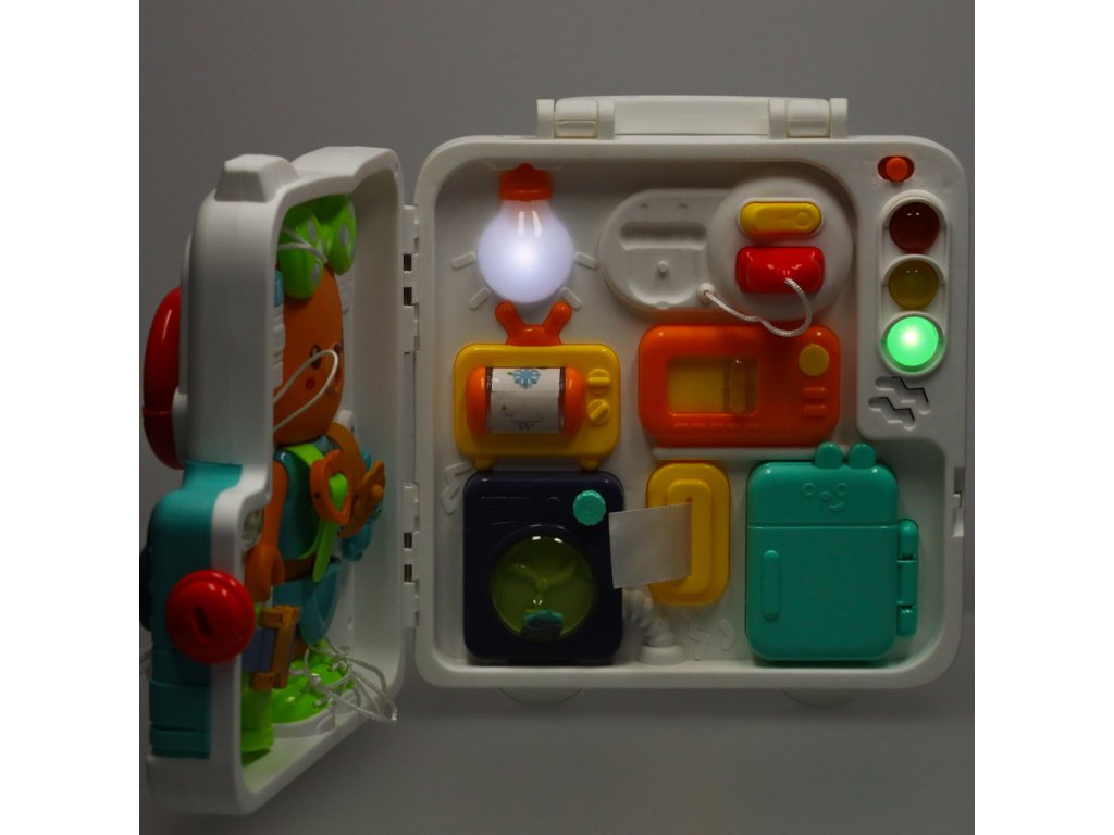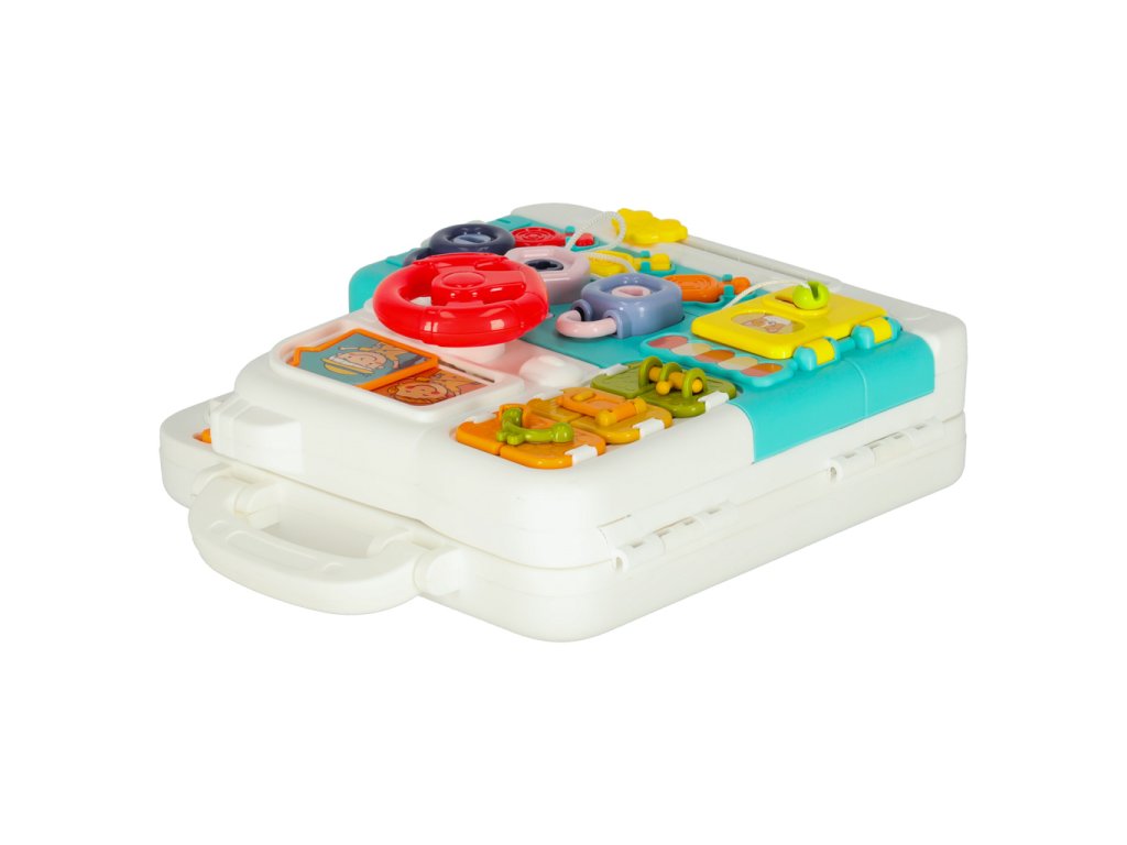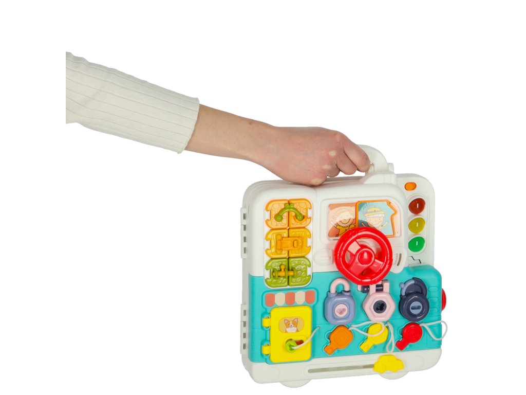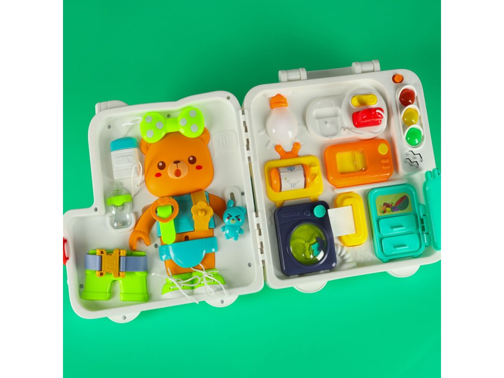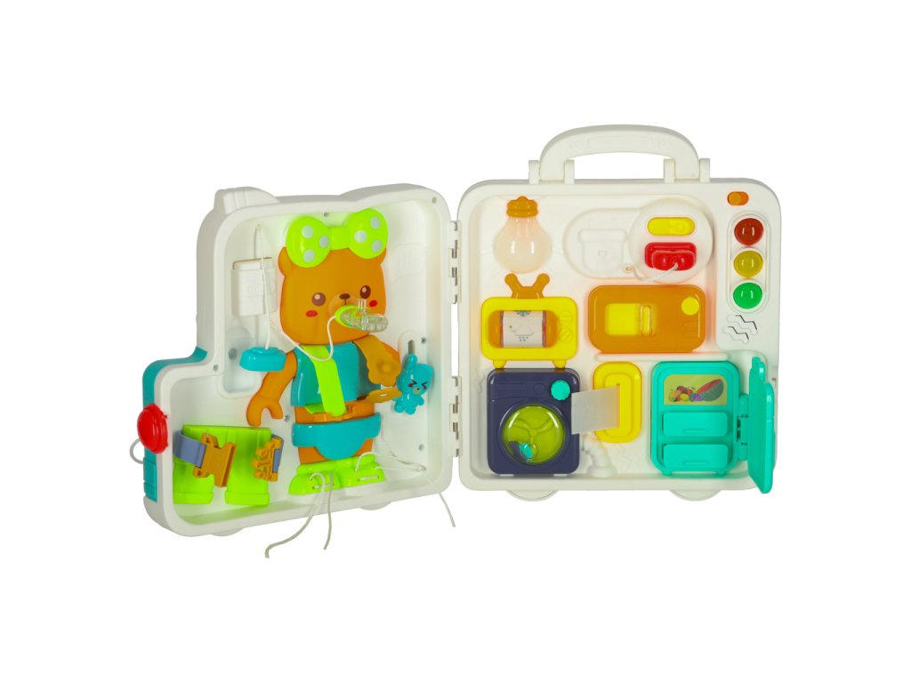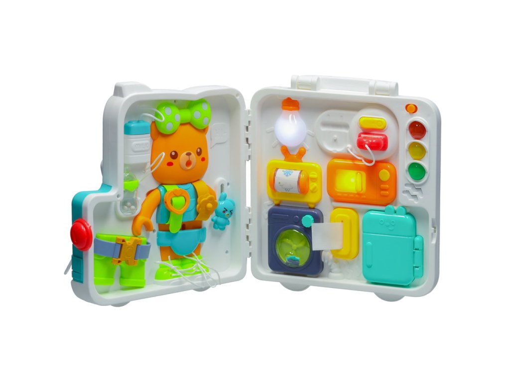 Medvídek, který se převléká, učí samostatnosti – povzbuzuje je, aby si zkusily zapnout pásek, zavázat tkaničky nebo zapnout přezku, stejně jako ve skutečném životě. Interaktivní semafor s blikajícími světly a příjemnými zvuky seznamuje děti s pravidly silničního provozu bez nudných pravidel – a to celou hrou. Barevná světla a zvuky dotvářejí obraz a zajišťují, že každý okamžik strávený u této hrací desky bude naplněn zvědavostí, vzrušením a úsměvem. Důležité je, že si děti mohou kufr vzít kamkoli chtějí. Je lehký, skládací a vybavený praktickým madlem.