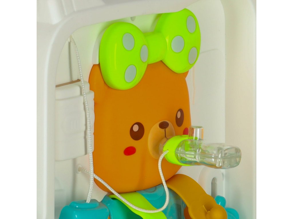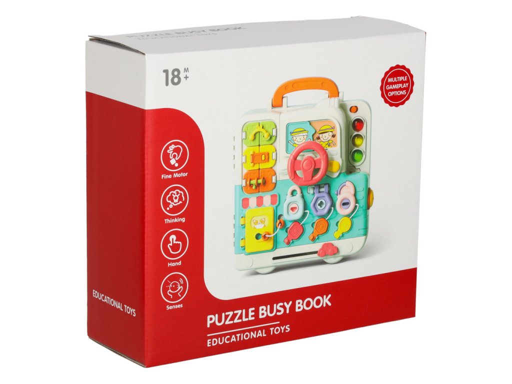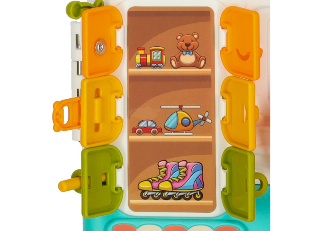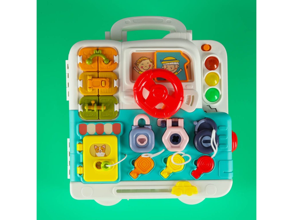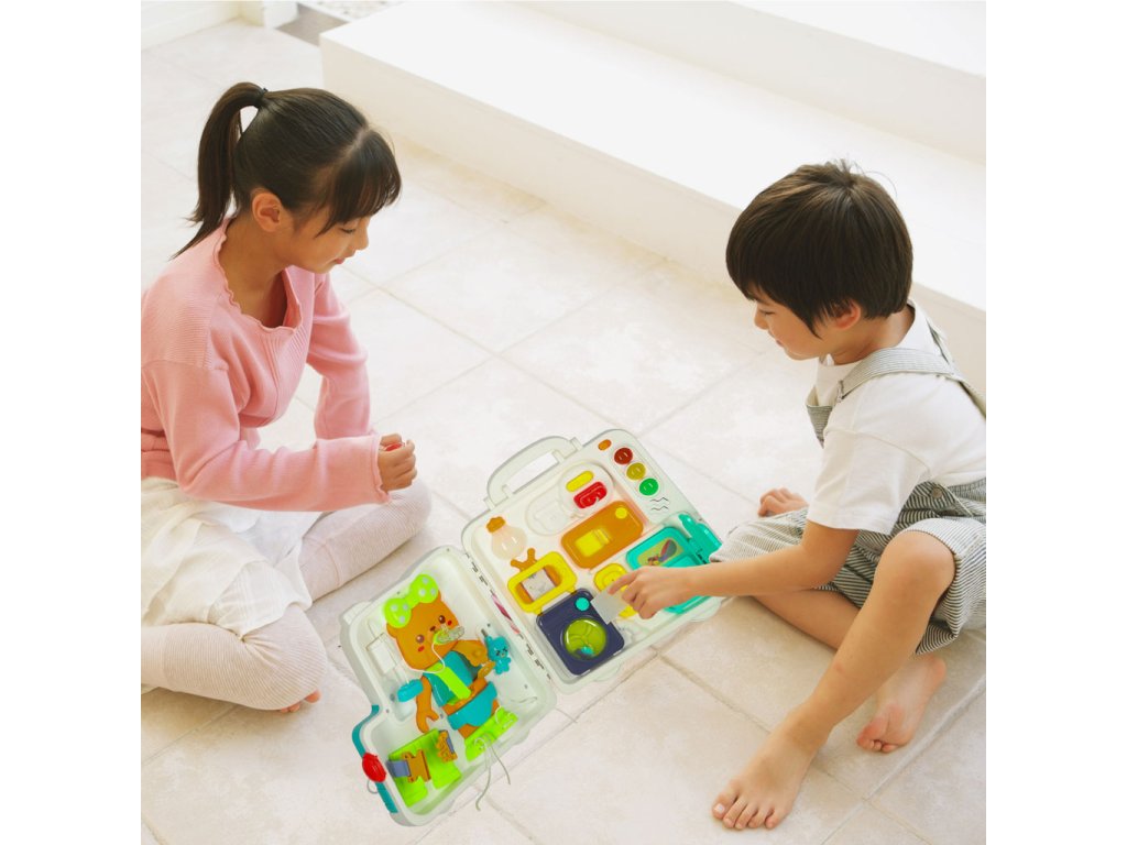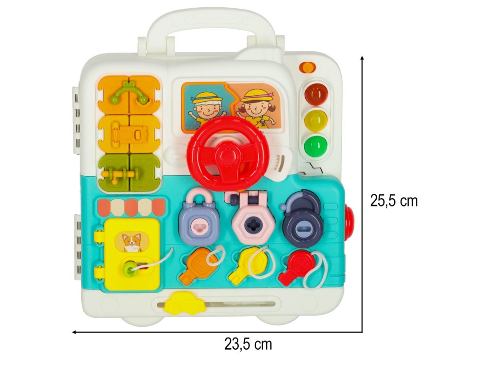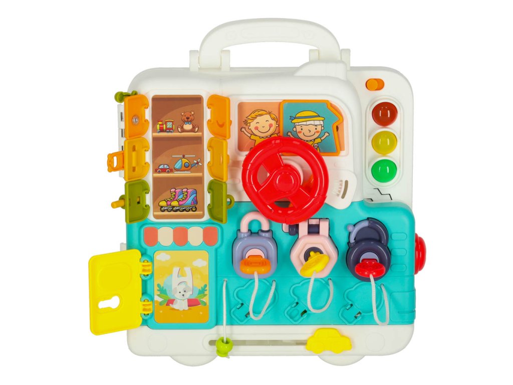 Medvídek, který se převléká, učí samostatnosti – povzbuzuje je, aby si zkusily zapnout pásek, zavázat tkaničky nebo zapnout přezku, stejně jako ve skutečném životě. Interaktivní semafor s blikajícími světly a příjemnými zvuky seznamuje děti s pravidly silničního provozu bez nudných pravidel – a to celou hrou. Barevná světla a zvuky dotvářejí obraz a zajišťují, že každý okamžik strávený u této hrací desky bude naplněn zvědavostí, vzrušením a úsměvem. Důležité je, že si děti mohou kufr vzít kamkoli chtějí. Je lehký, skládací a vybavený praktickým madlem.