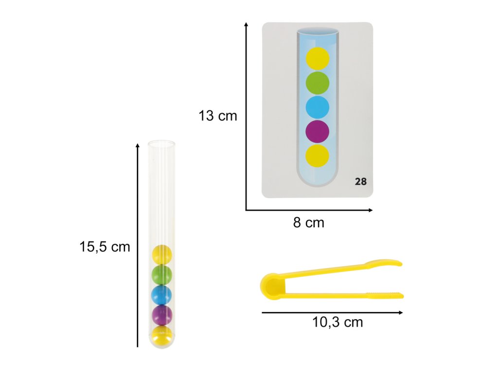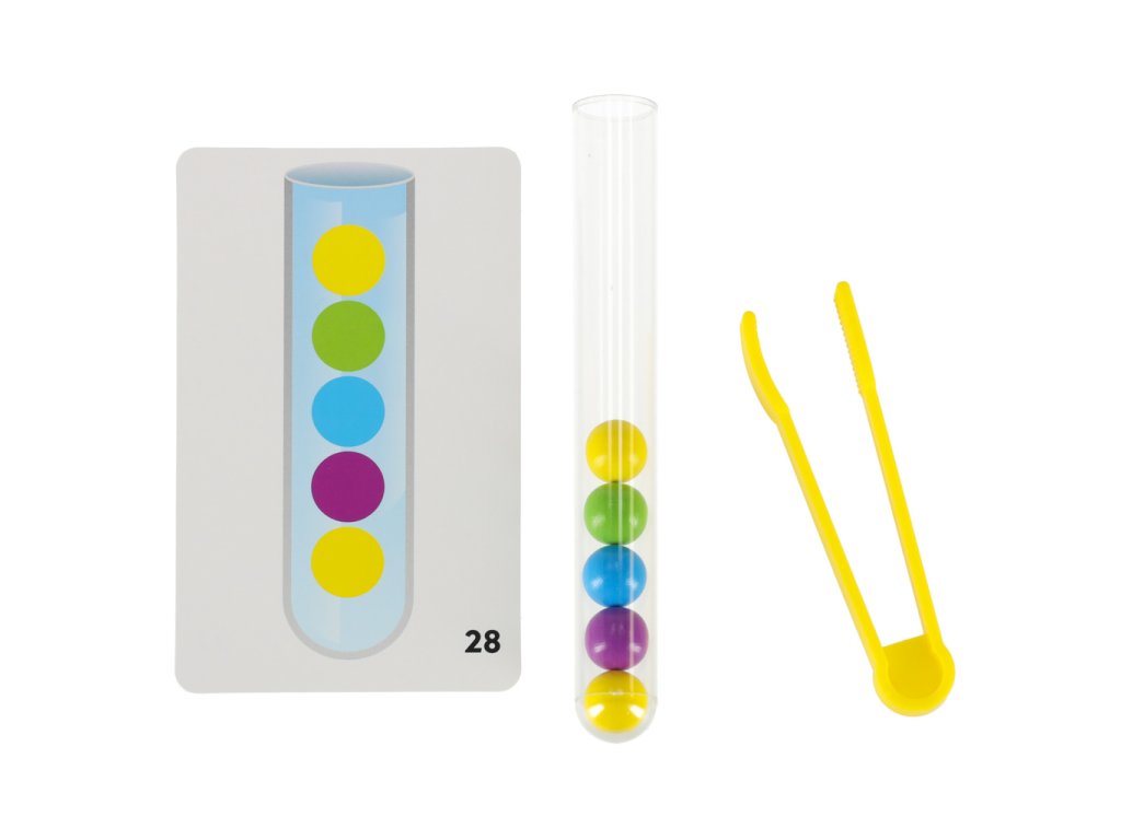 Hlavním cílem hry je třídit míčky do vhodných zkumavek! Batole to zvládne rukama nebo pomocí přiložených kleští!