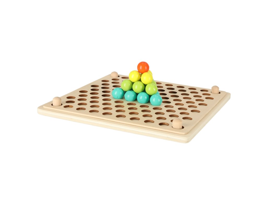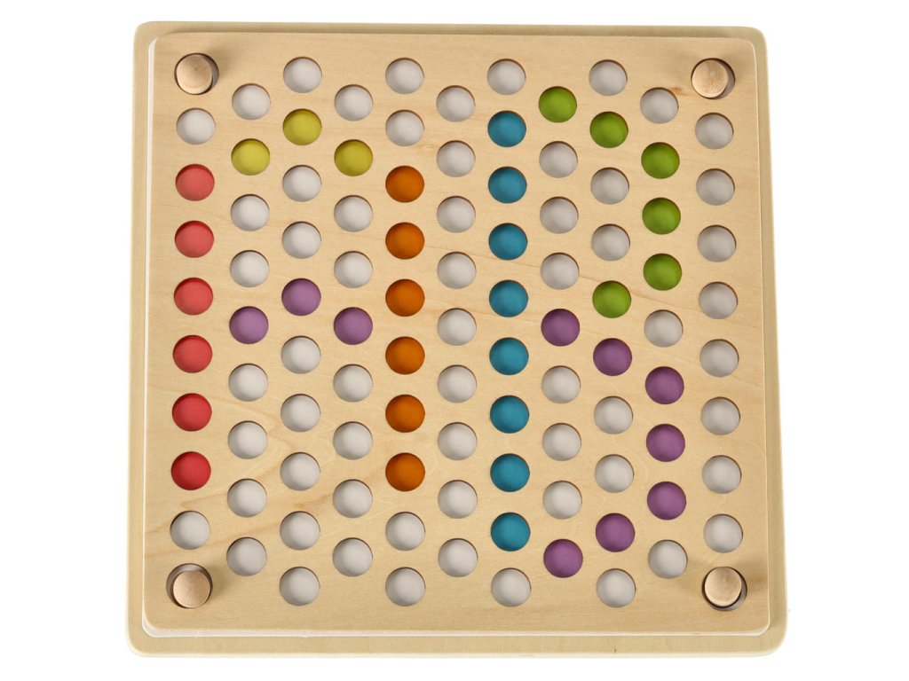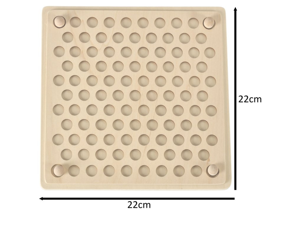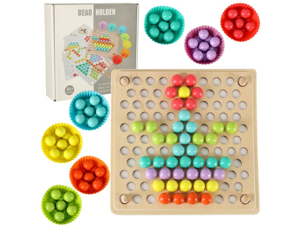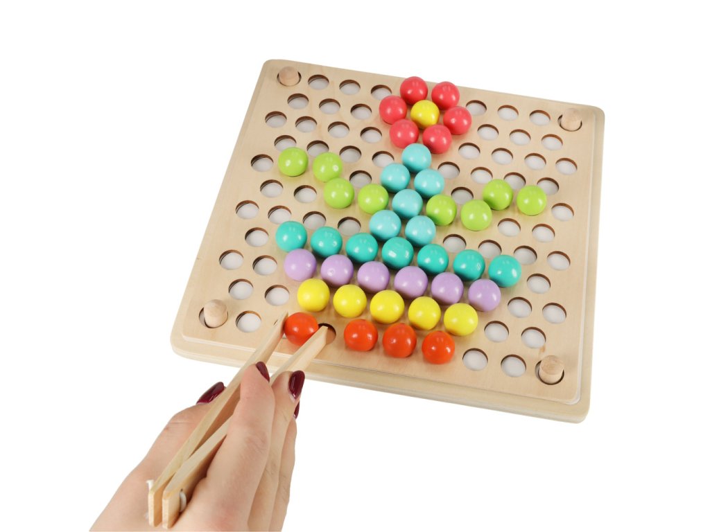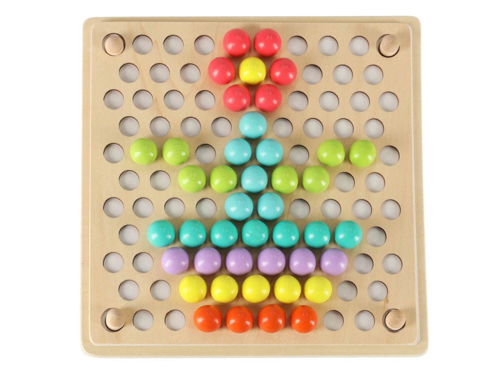 Dřevěná vzdělávací mozaika je hračka, která podporuje rozvoj dětí prostřednictvím zábavného skládání barevných obrázků z barevných kuliček. Deska o rozměrech 22 x 22 cm má speciální otvory, kam lze umístit 77 barevných kuliček a vytvořit tak různé vzory a kompozice.