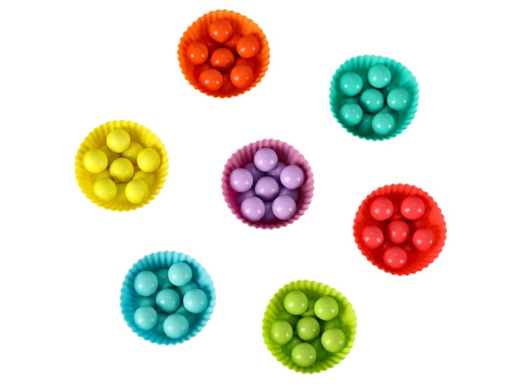 Sada silikonových kelímků usnadňuje třídění dřevěných kuliček do jednotlivých barev. Osm kartiček inspiruje hotovými obrázky k reprodukci.