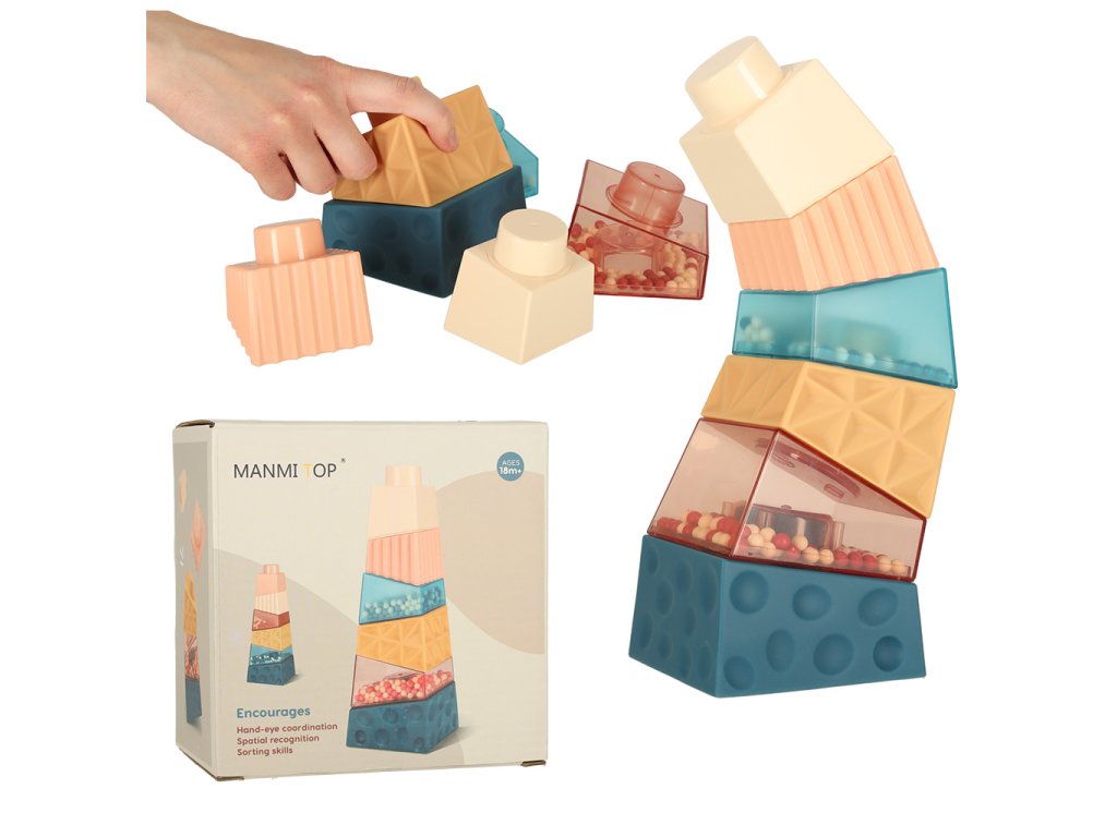 Každý blok je jiný - dva bloky mají uprostřed kuličky, které se během hry sypou, a ostatní bloky mají různé textury. Díky rozmanitým barvám a texturám bude hračka vynikajícím vizuálním a hmatovým trenažérem. Při hře s věží bude dítě rozvíjet své kognitivní schopnosti a poznávat úskalí stavby. Procvičí si také manuální dovednosti, jako je přesnost ruky nebo koordinace oko-ruka.