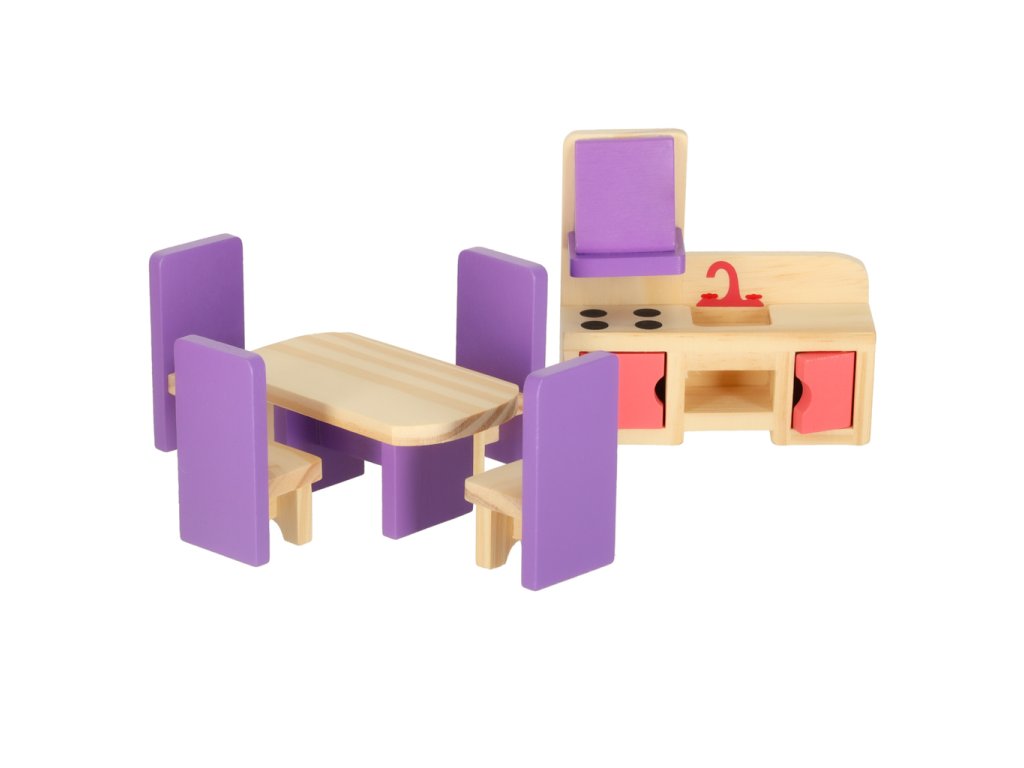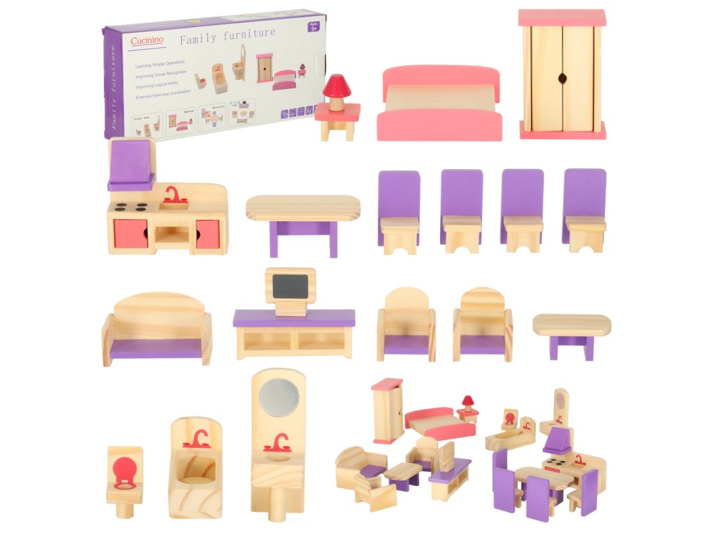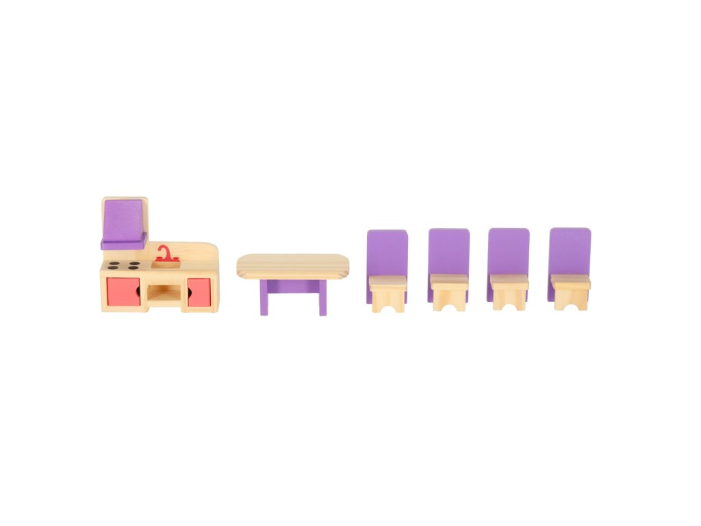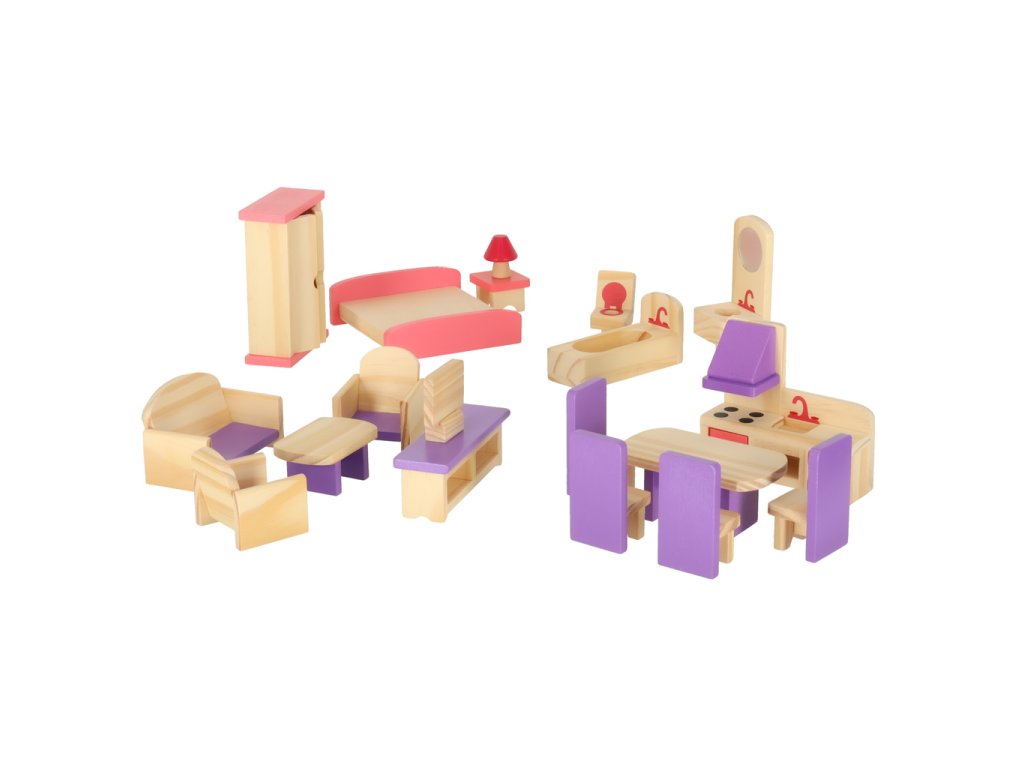 Sada dřevěného nábytku je navržena jako doplněk k domečku pro panenky. Obsahuje vybavení do obývacího pokoje, ložnice, koupelny a kuchyně, které vytváří realistické a funkční interiéry pro panenky. Nábytek je vyroben z hladce broušeného dřeva a natřen bezpečnými, odolnými barvami ve fialové a růžové barvě. Sada podporuje rozvoj prostorové představivosti a kreativity dětí.