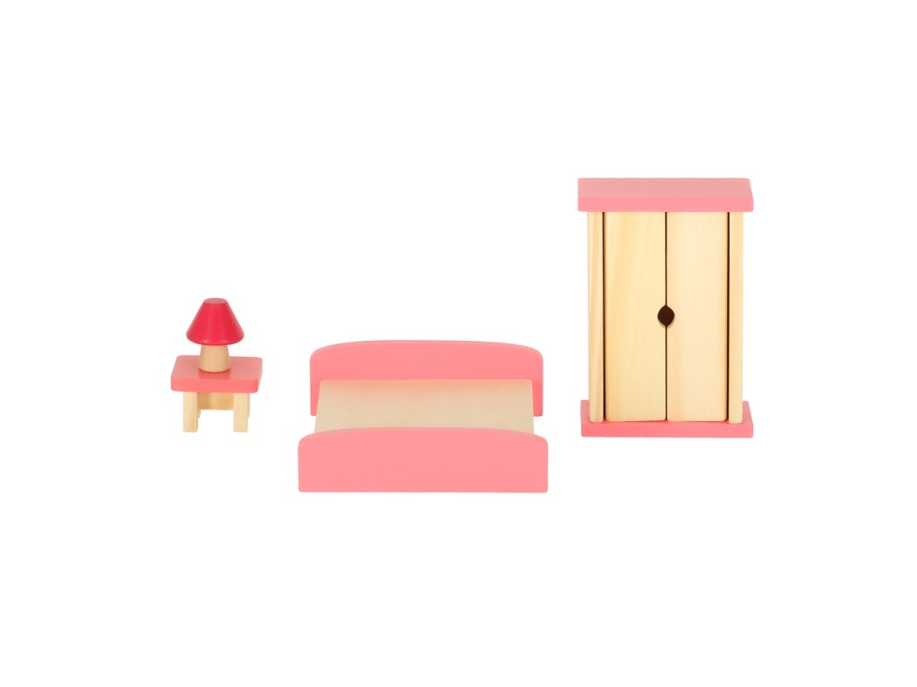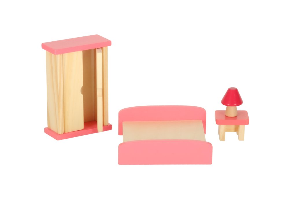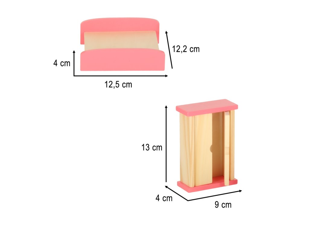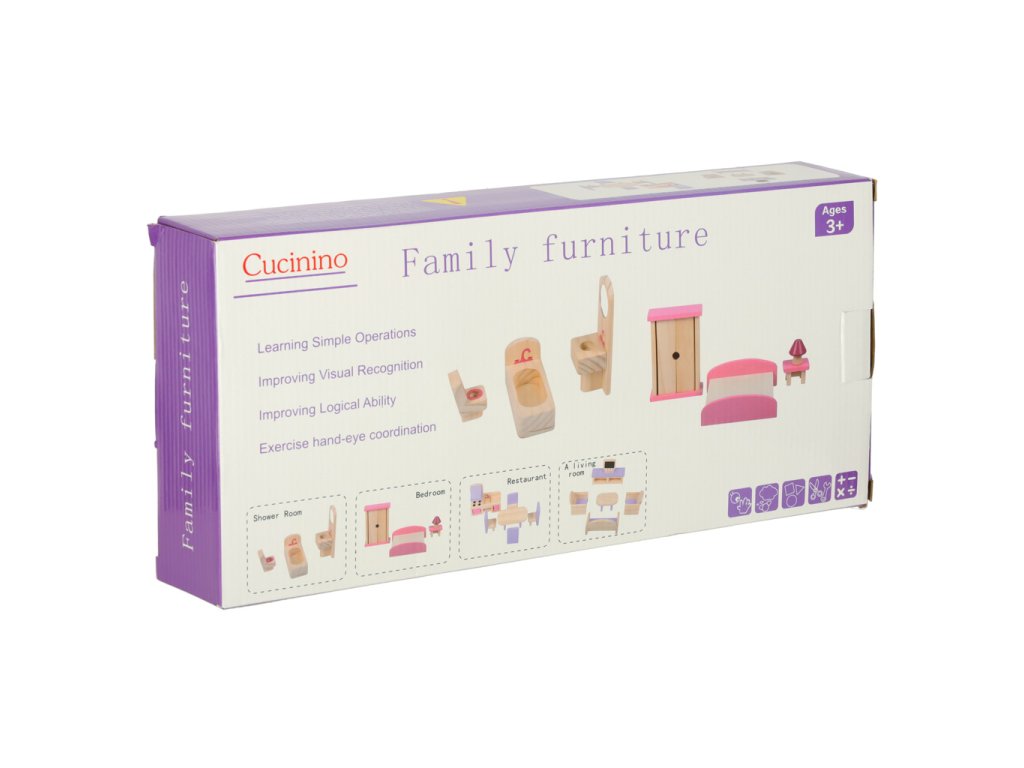 Sada dřevěného nábytku je navržena jako doplněk k domečku pro panenky. Obsahuje vybavení do obývacího pokoje, ložnice, koupelny a kuchyně, které vytváří realistické a funkční interiéry pro panenky. Nábytek je vyroben z hladce broušeného dřeva a natřen bezpečnými, odolnými barvami ve fialové a růžové barvě. Sada podporuje rozvoj prostorové představivosti a kreativity dětí.