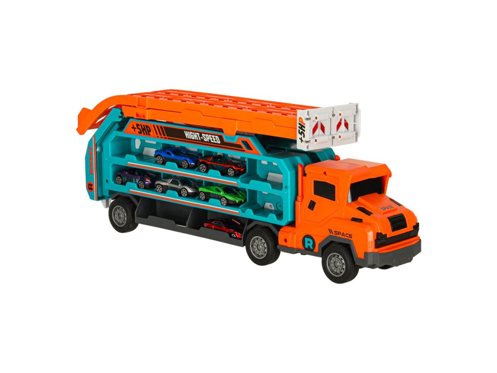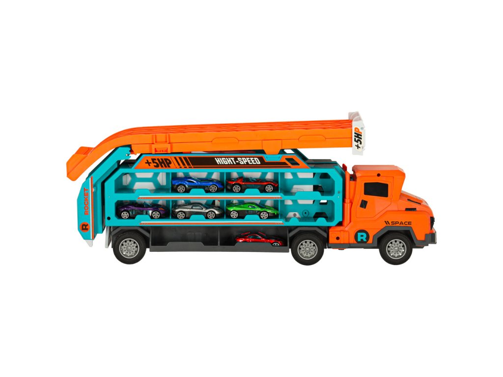 Nákladní vůz s dráhou oranžový + 6 aut