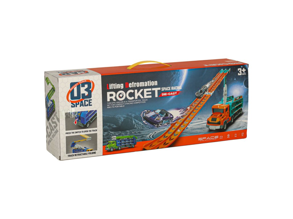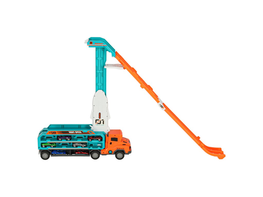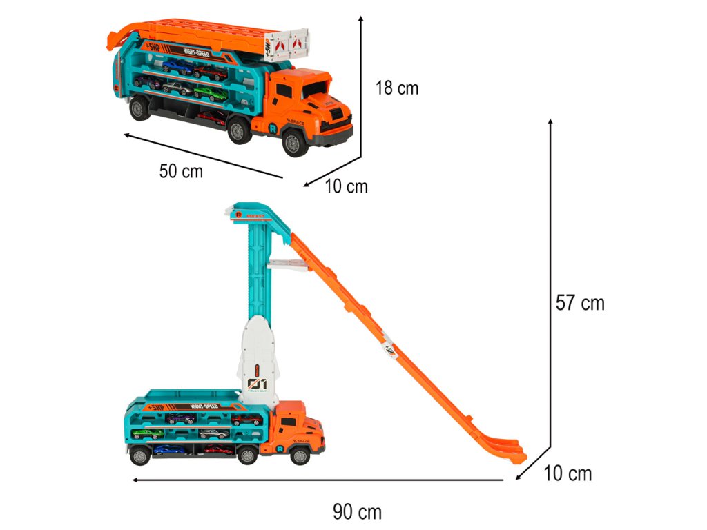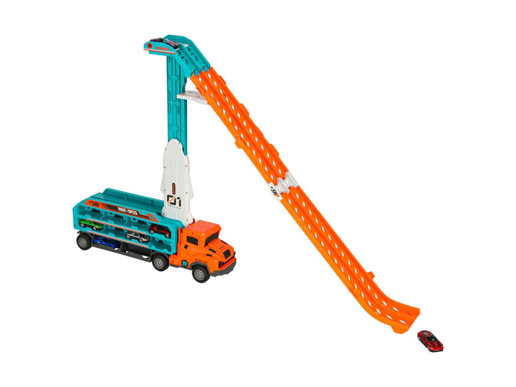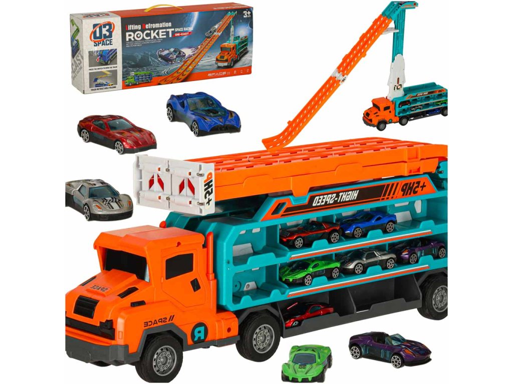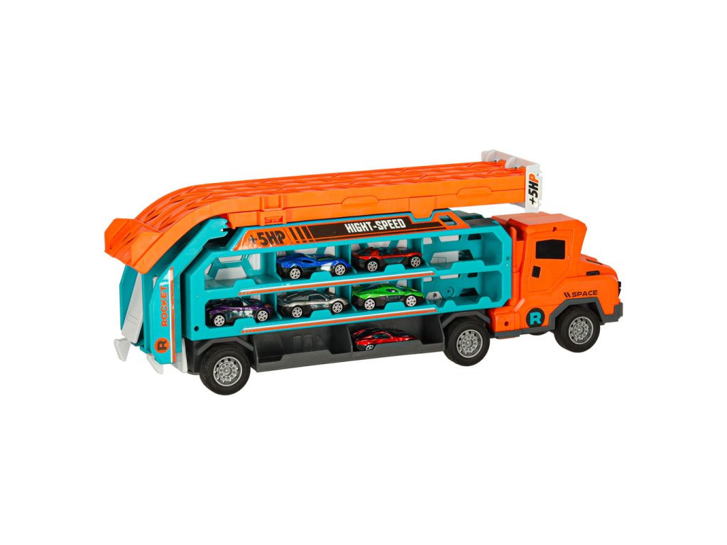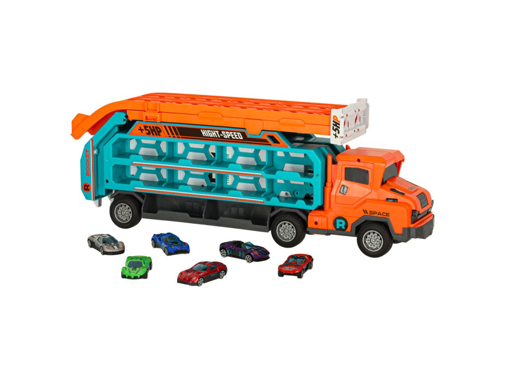 Oranžovo-modrý přívěs kamionu, který se promění v závodní dráhu, je skvělou hračkou pro malé milovníky aut. Kamion (50x10x18 cm) přepravuje šest malých autíček. Po rozložení se promění ve dvoustopou závodní dráhu s výškou 57 centimetrů, ideální pro pořádání závodů. Hračka pomáhá rozvíjet drobnou motoriku dětí a koordinaci oko-ruka.