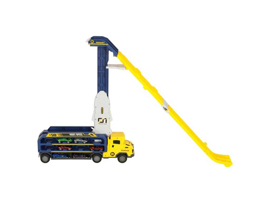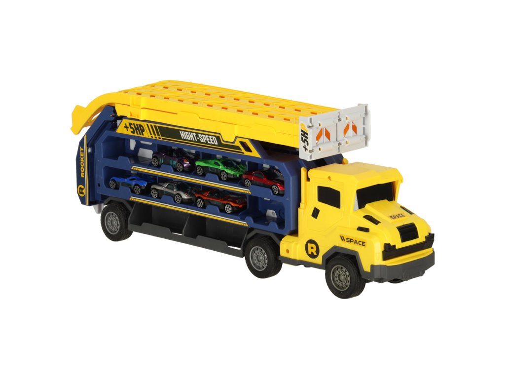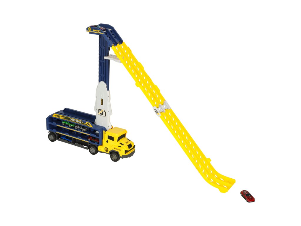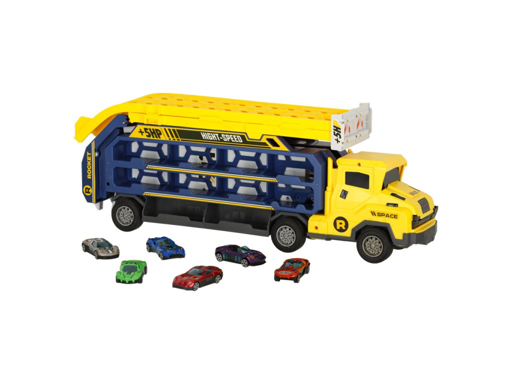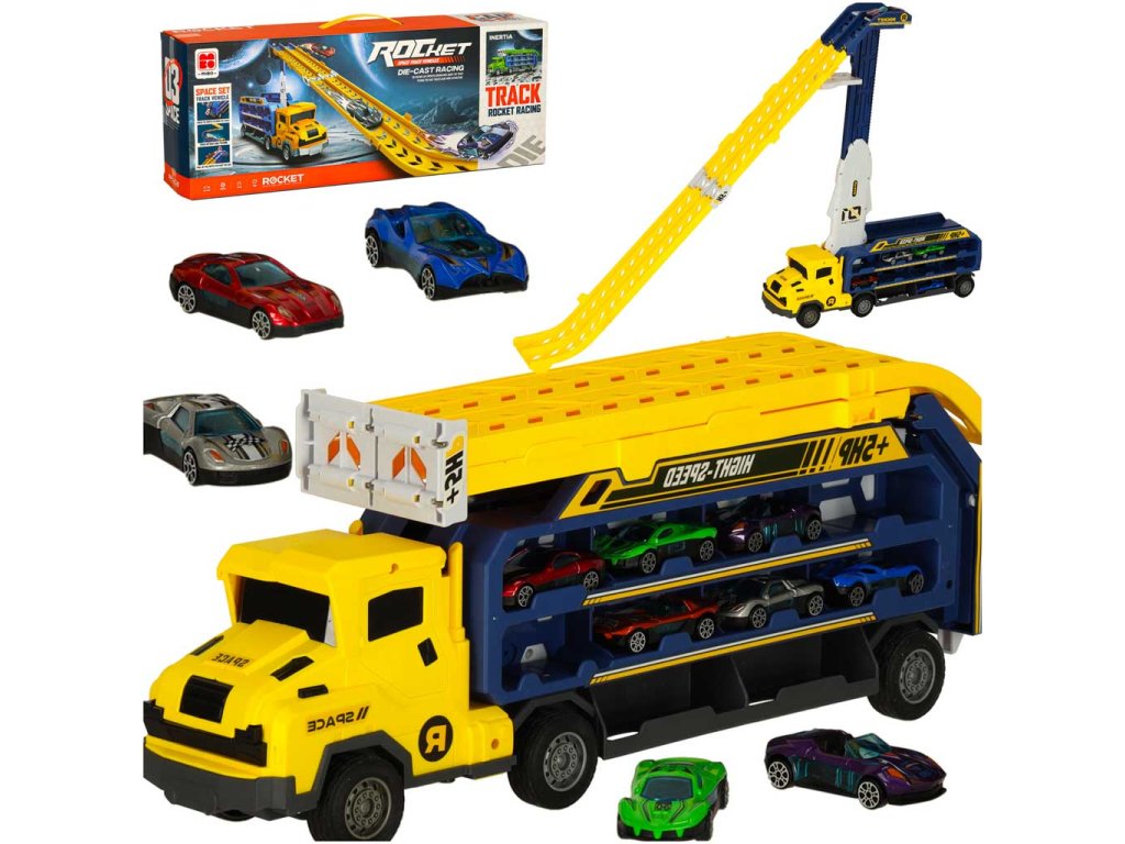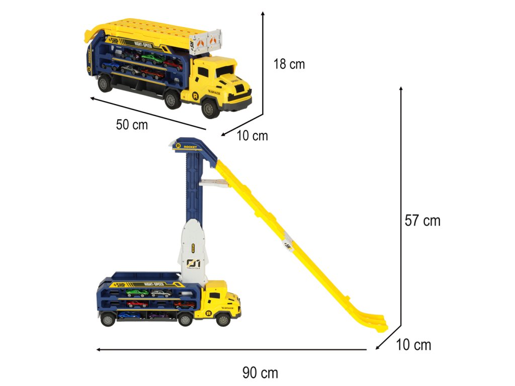 Žluto-modrý přívěs pro kamion, který se promění v závodní dráhu, je fantastickou nabídkou pro malé fanoušky aut. Multifunkční přepravník aut o rozměrech 50x10x18 cm přepravuje šest malých aut. Promění se ve dvoukolejnou závodní dráhu o výšce 57 centimetrů, na které mohou auta proti sobě závodit. Hračka podporuje rozvoj drobné motoriky a koordinace ruka-oko u dětí.