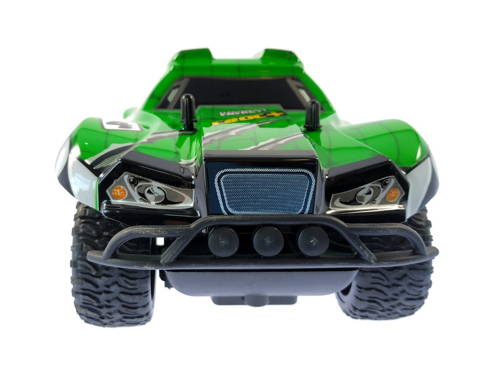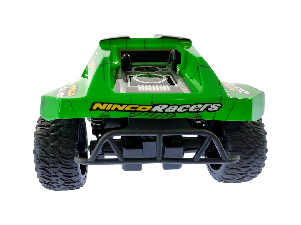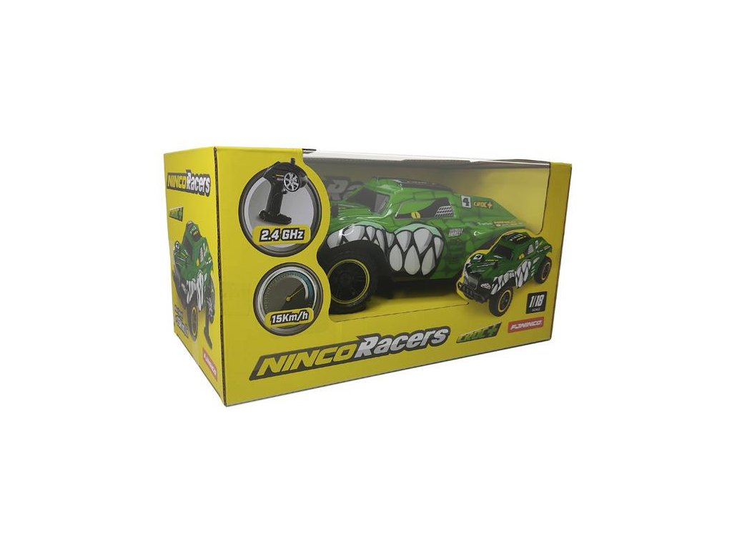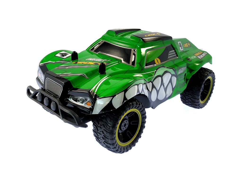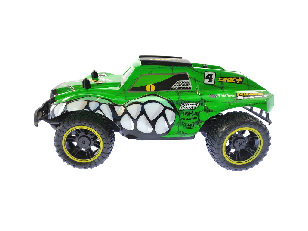Terénní RC hračka pro děti Nincoracers Croc+ v měřítku 1:18 s délkou téměř 27 cm, patří do kategorie Short course. Díky větším rozměrů model lepé překonává nerovnosti v terénu. V předu je opatřen ochranným nárazníkem. Velká kola v kombinaci s pružinovými tlumiči skvěle kopírují terén. Karoserie je z odolného plastu. Má atraktivní zelené zbarvení s motivem čelisti se zuby. Model jede rychlostí až 15 km/h. Model je na tužkové baterie.