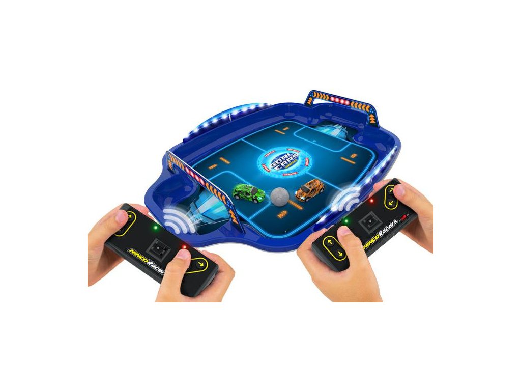 NINCORACERS Goalcars Supercup je zábavná kombinace fotbalu a RC autíček. Ovládejte autíčka dálkově pomocí ovladačů a dejte gól protihráči na fotbalovém hřišti s mantinely o rozměrech 70x50cm. Hřiště lze snadno sestavit. Autíčka s NiMH akumulátorem jsou vybaveny LED světly.