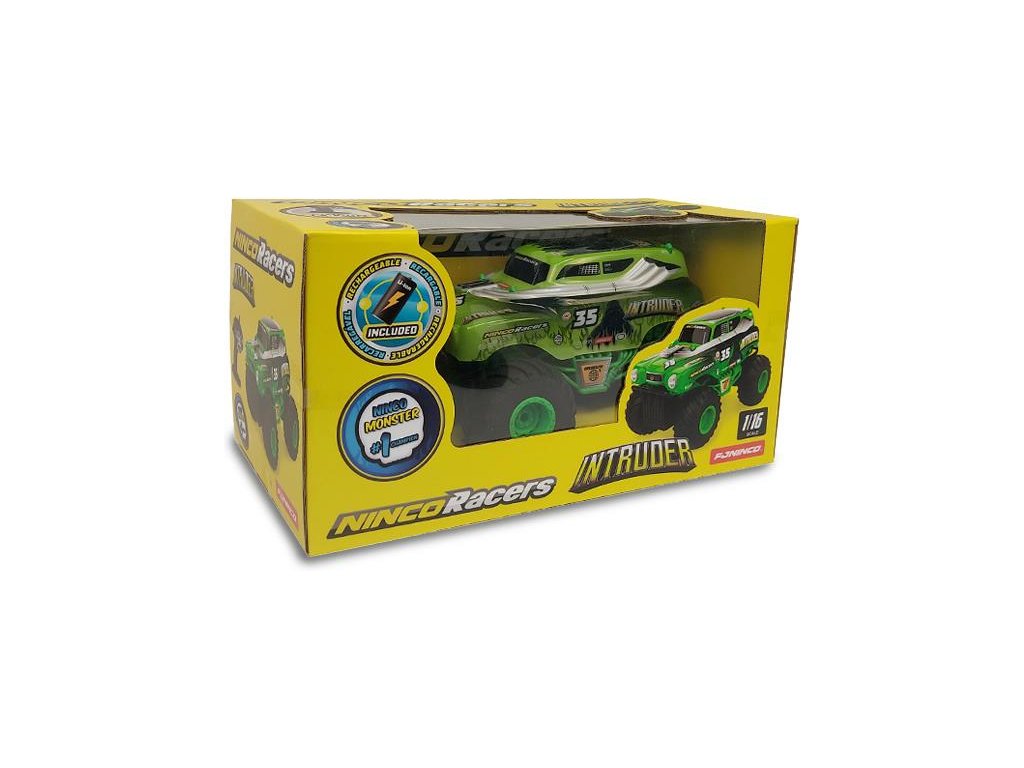 NINCORACERS Intruder je RC hračka na dálkové ovládání v měřítku 1:16. Jedná se o jeden z nejoblíbenějších aut typu monster truck s velkými širokými koly a vysokým podvozkem. Karoserie je typická pro americké závody Monster Jam. Karoserie byla konstruována tak, aby odolala dětským hrám. Spolehlivý volantový vysílač pracuje na frekvenci 2.4 GHz. Auto jede rychlostí až 15 km/h a je poháněno Li-Ion akumulátorem, který nabijete přiloženým USB nabíječem.