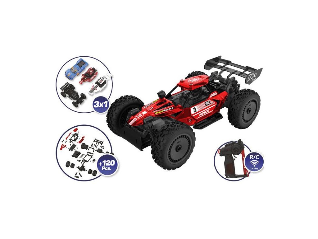 Stavebnice auta na dálkové ovládání NINCORACERS Stream 3 in 1. Naučte děti hravou formou jak funguje mechanika s autíčkem, které si sami sestaví z více než 120 dílů. Stavba je přitom jednoduchá a není potřeba nářadí. Na výběr jsou 3 karoserie. Provoz auta je na pět tužkových baterií typu AA (3ks do autíčka, 2ks do vysílače) (baterie nejsou součástí balení). Vysílač pracuje spolehlivě a bez rušení, či výpadků v pásmu 2.4 GHz. Autíčko má pružinové tlumiče, náhon zadních kol 2WD a měkké gumové pneumatiky. Rychlost je až 8 km/h.