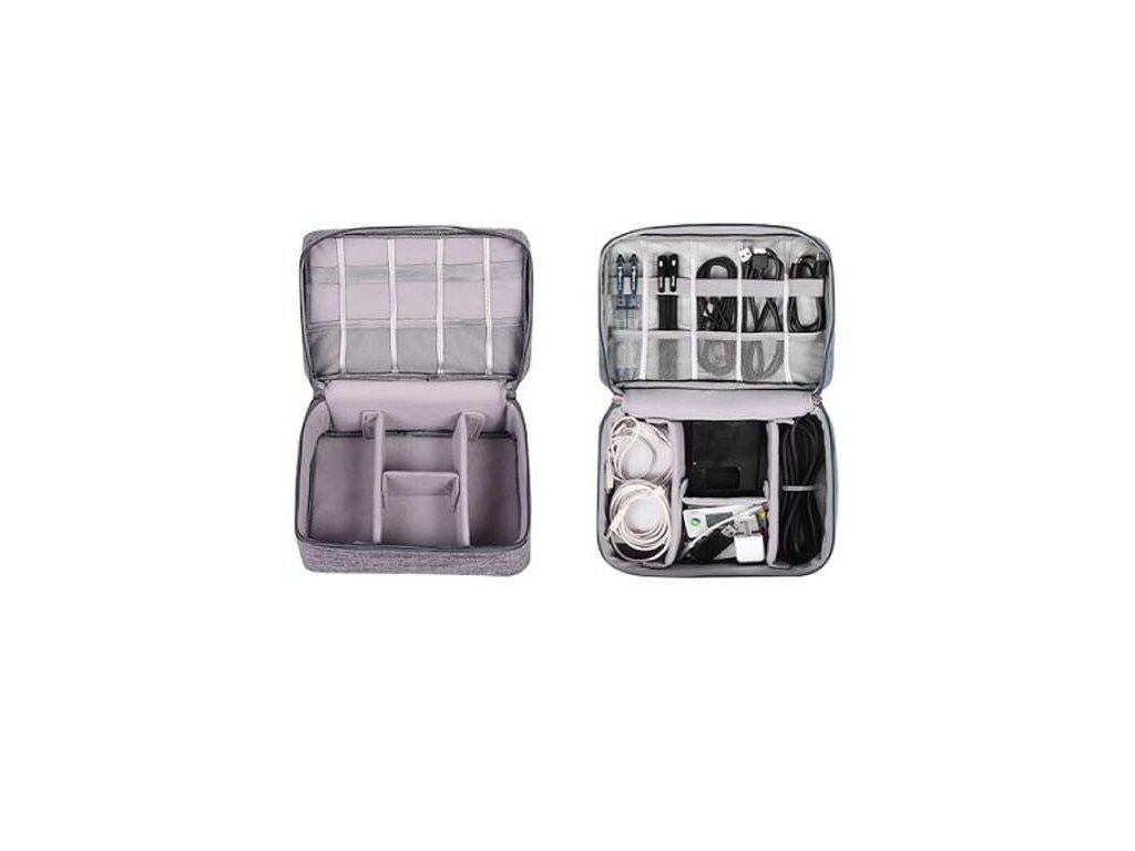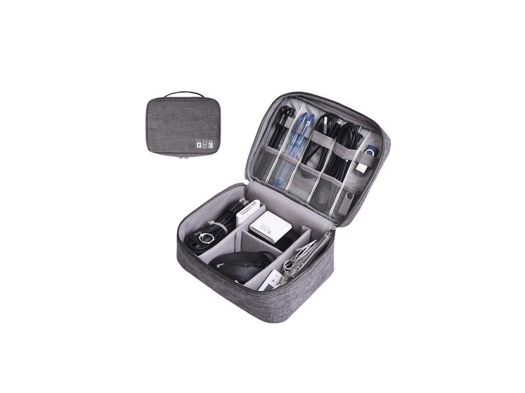 Pouzdro má několik přihrádek a kapes, které umožňují oddělené uložení různých typů kabelů, nabíječek, sluchátek atd. Kapsy v hlavní části pouzdra jsou pohyblivé a kapsy na klopě mají síťovinu a elastické pásky pro snadnější organizaci