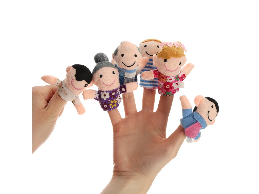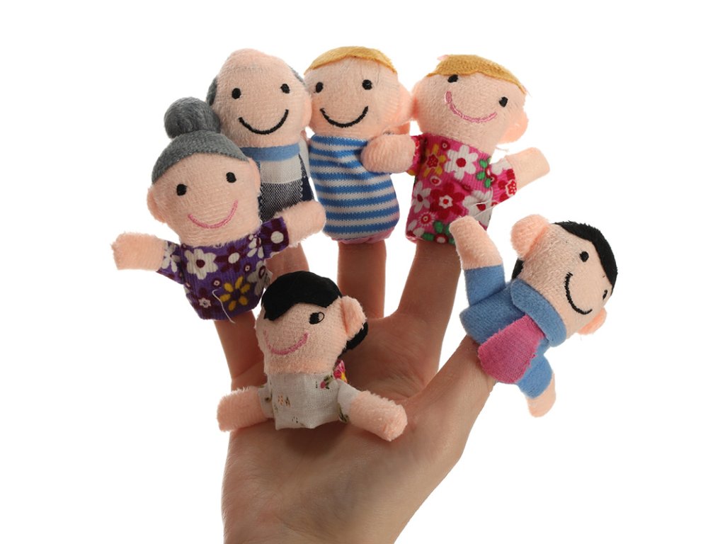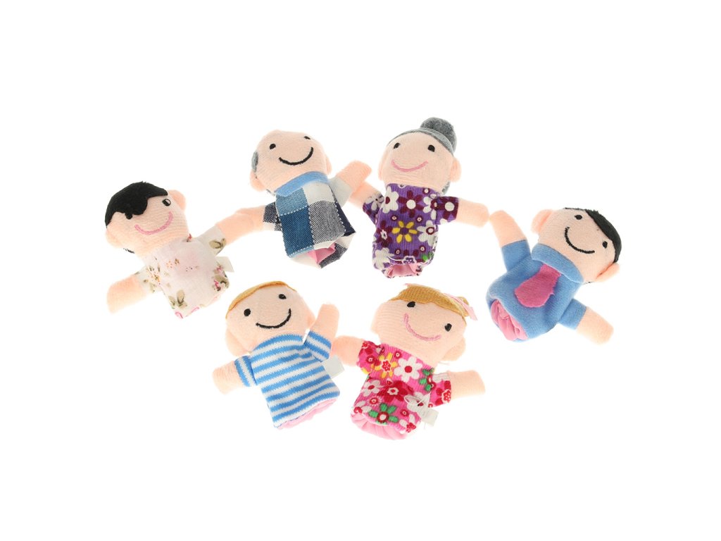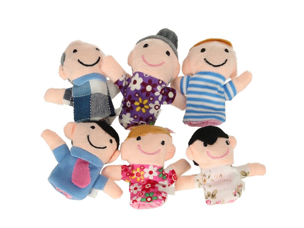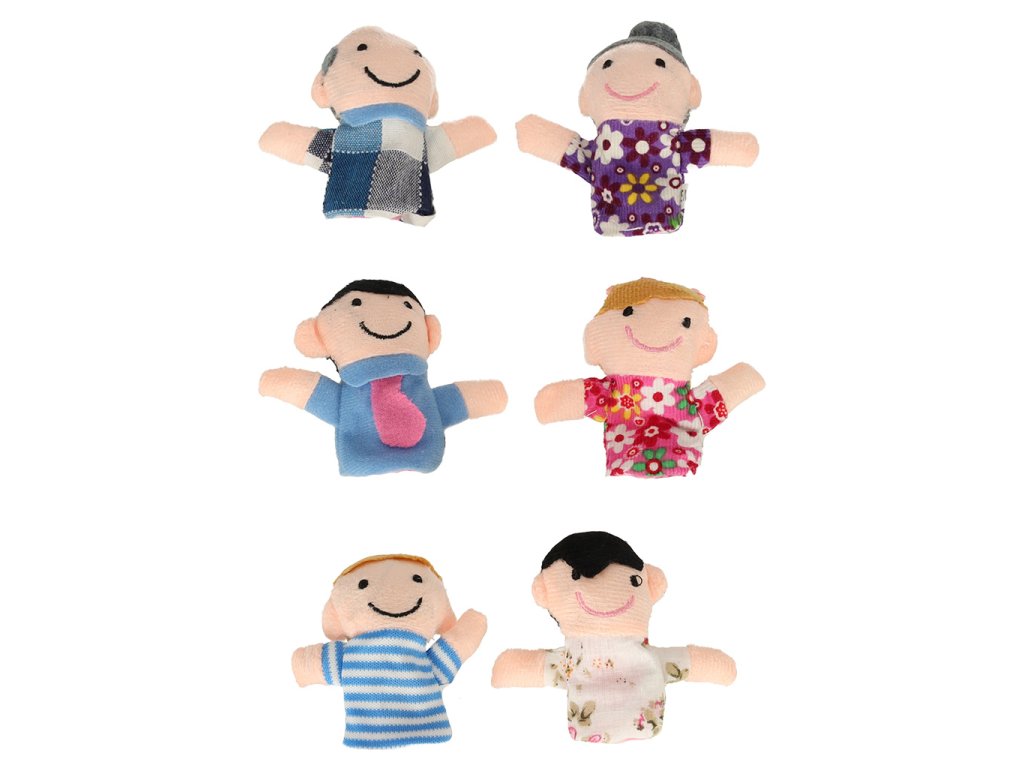 Šest různobarevných loutek - rodina: táta, maminka, babička, dědeček, dcera, syn.