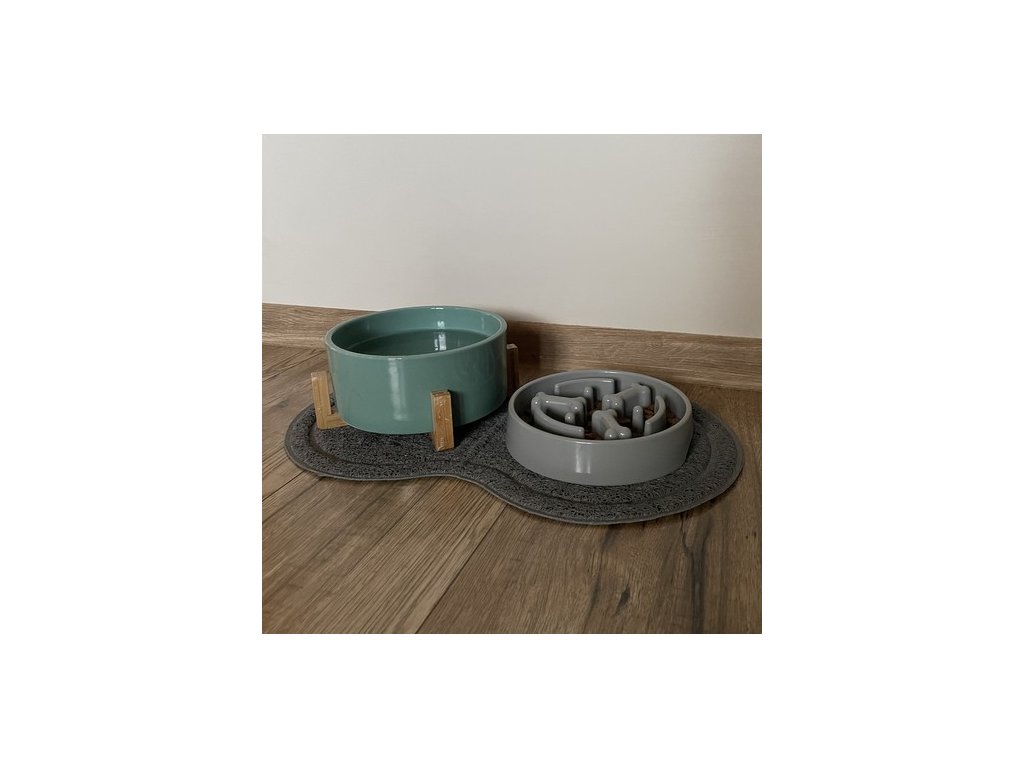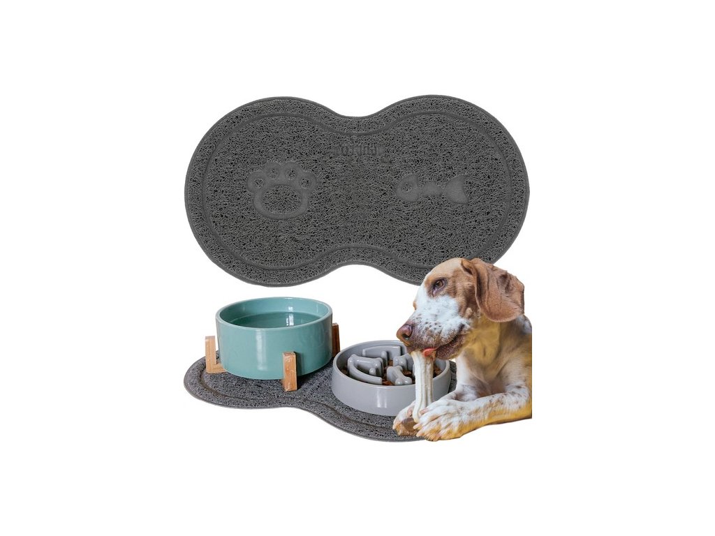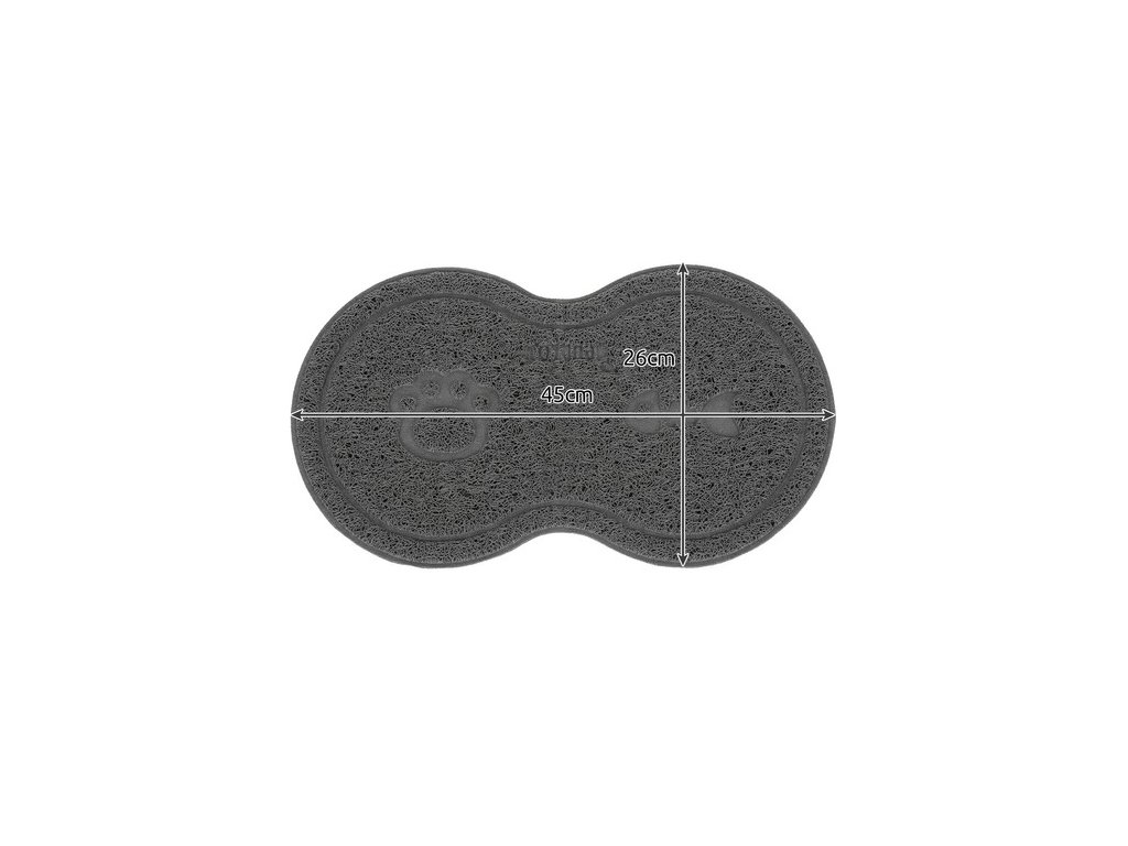 - Podložka má oválný a dvojitý tvar, který se perfektně hodí do většiny prostor, jak v kuchyni, tak i na jiných místech v domě, kde jsou misky s jídlem a vodou pro psa. Díky elegantní šedé barvě se rohož hodí do každého interiéru, není příliš nápadná a zároveň dodává jemné kouzlo. Další výhodou podložky je, že pojme 2 misky.