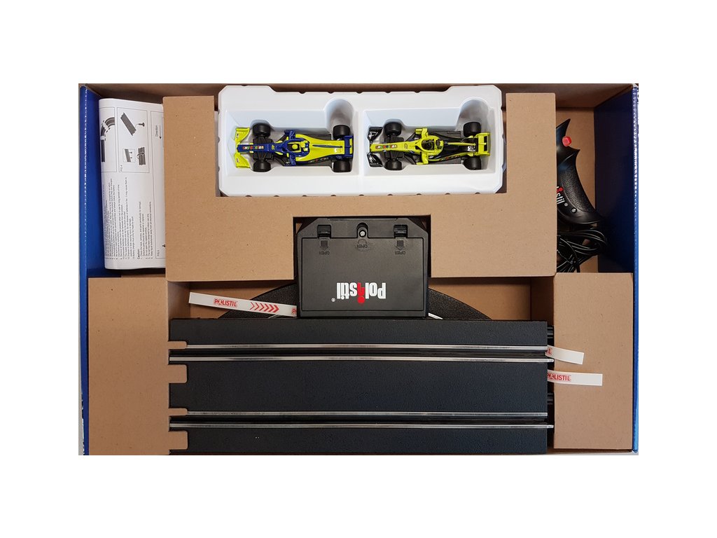 Polistil Autodráha 1:43 VR46 Formula Racing - uživatelsky jednoduchá analogová elektrická autodráha, pro malé i velké. Podle obrázku v manuálu sestavíte díly autodráhy připojíte ovladače a doplníte 8x AA tužkové baterie - EM-B1320. Zapnete vypínač na startovní rovince a už můžete začít závodit. Každý ovladač řídí jedno autíčko na jedné dráze. Autodráha pro děti se dvěma jízdními pruhy má délku 2,27 m. Pro složení je nutný prostor 94 x 46 cm.