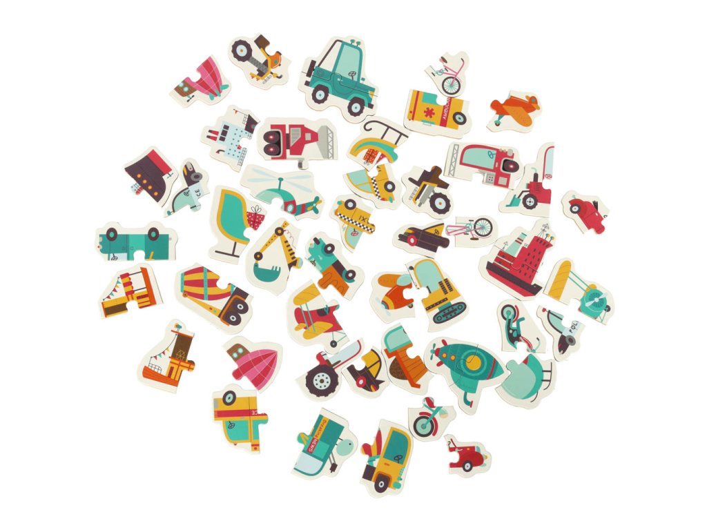 Puzzle obsahují malá i velká vozidla - jednokolky, auta, stavební stroje, vodní i vzdušná vozidla. Spojování a kombinování tvarů do různobarevných obrázků poskytne batoleti spoustu zábavy. Puzzle procvičuje logické myšlení a rozpoznávání vzorů. První pexeso s puzzle je dobrý způsob, jak se naučit trpělivosti a také procvičit paměť a logické myšlení. Taková vzdělávací zábava pro nejmenší také usnadňuje učení jazyků. Na zadní straně puzzle jsou nápisy v angličtině a čínštině. Při hraní se batole může učit jednotlivá slova v angličtině, zatímco o něco starší dítě se může učit pravopis slov v čínštině.