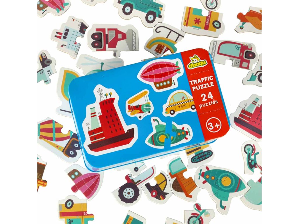 Kreativní puzzle s vozidly jistě batole na dlouhou dobu zaujme. Obrázky s různými dopravními prostředky efektivně zpestří dětskou hru. Hračka je určena pro děti od 3 let. Puzzle je vyrobeno z dřevěné MDF desky, takže je ideální pro první dětské puzzle. Puzzle jsou baleny v kovové krabičce, což usnadňuje jejich skladování a udržování pořádku po hraní.