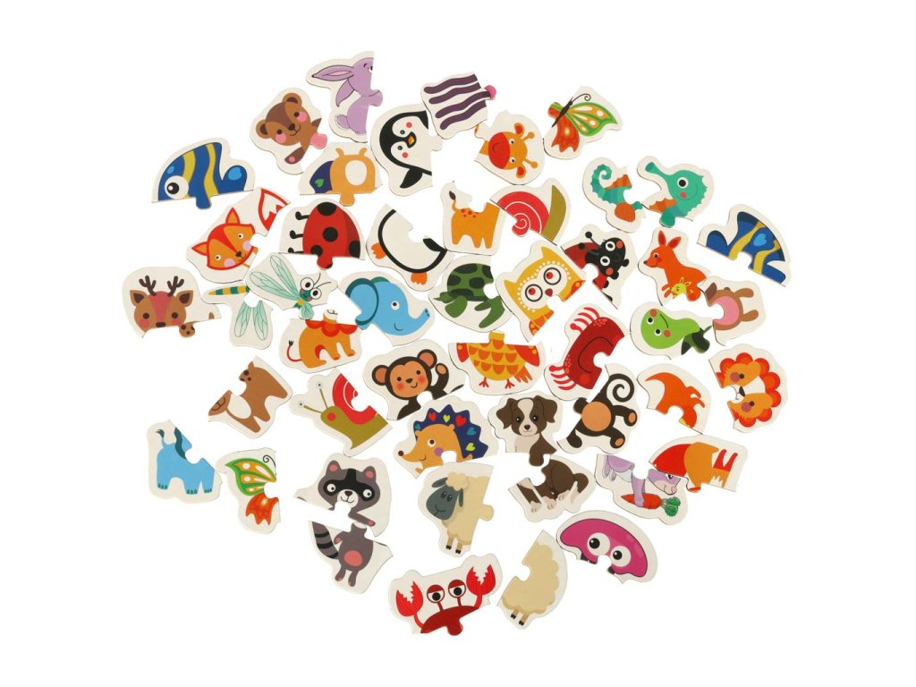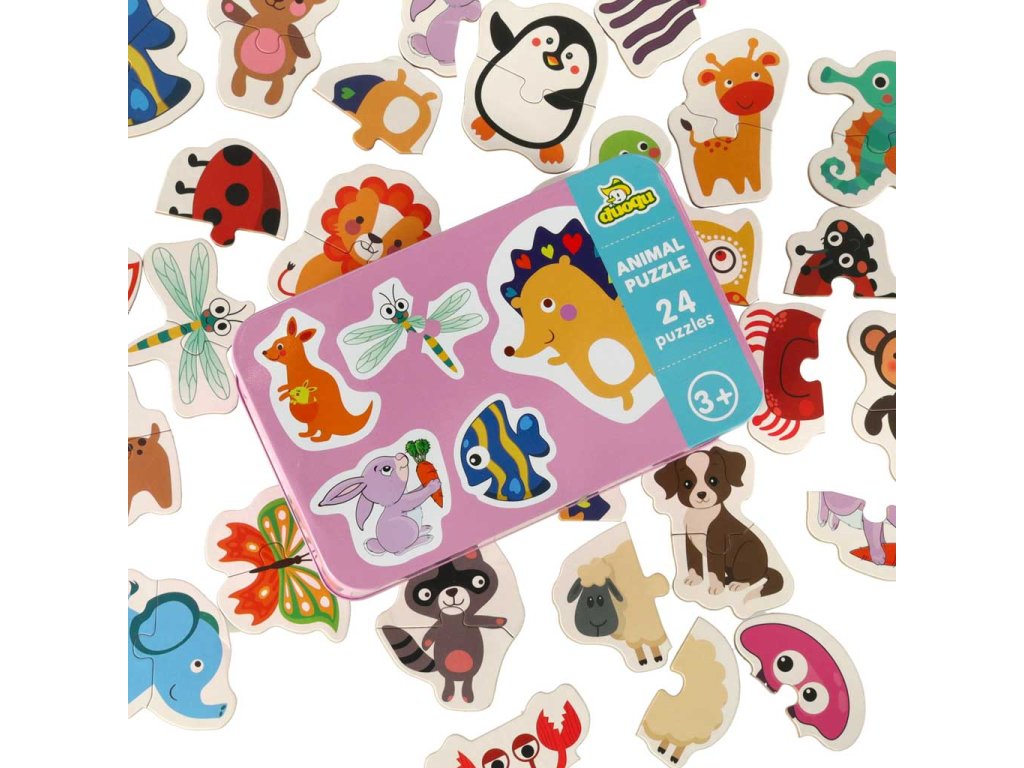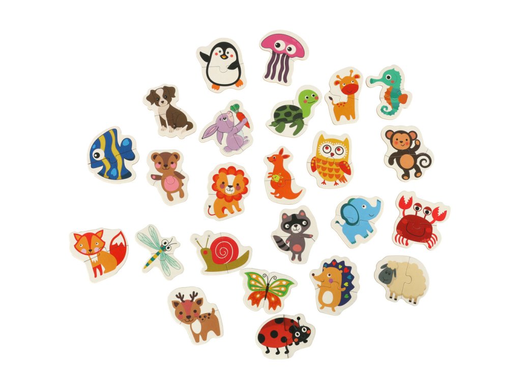 Sada puzzle je kreativní a vzdělávací hra, která zahrnuje spárování dvou dílků a vytváření obrázků zvířat. Sada obsahuje 24 puzzle, které po spojení vytvoří 12 různých ilustrací zobrazujících rybu, šneka, jelena a další zvířata.