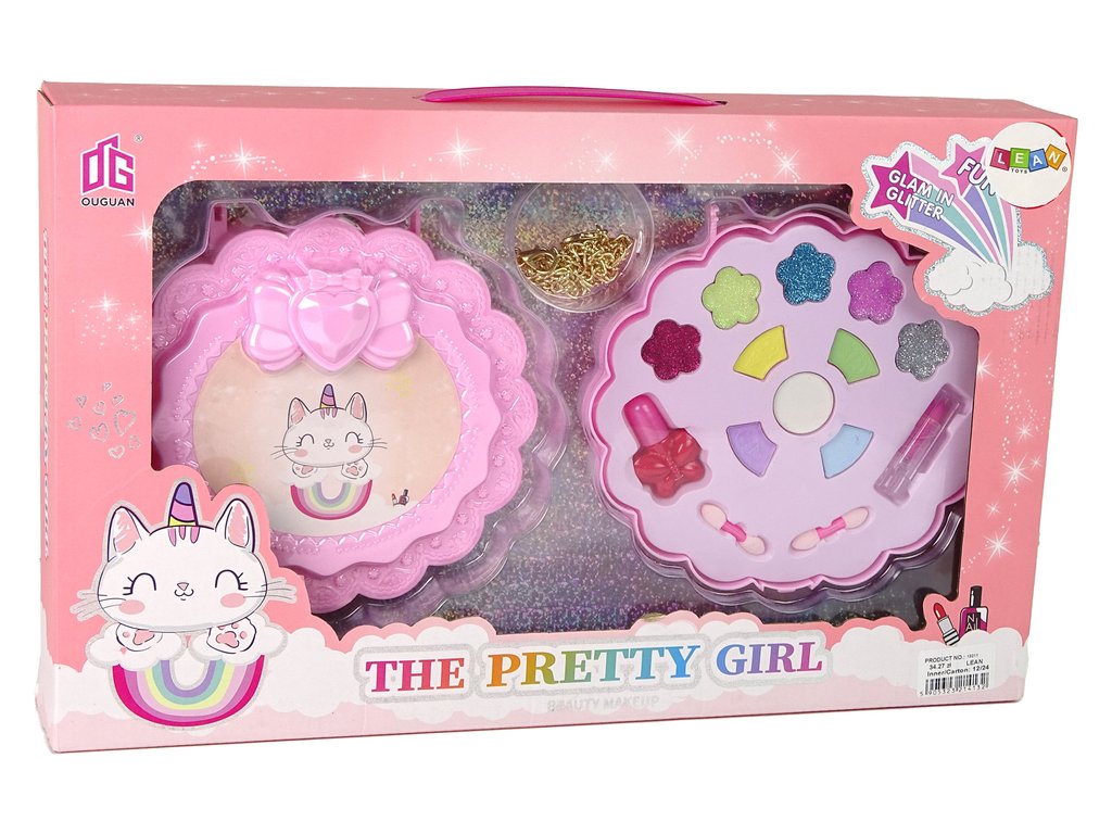 Sada obsahuje barevné třpytky, rtěnku, lak na nehty, oční stíny, štětec ve tvaru korálku a zlatý náhrdelník.