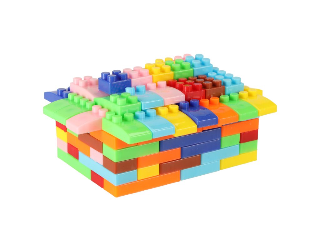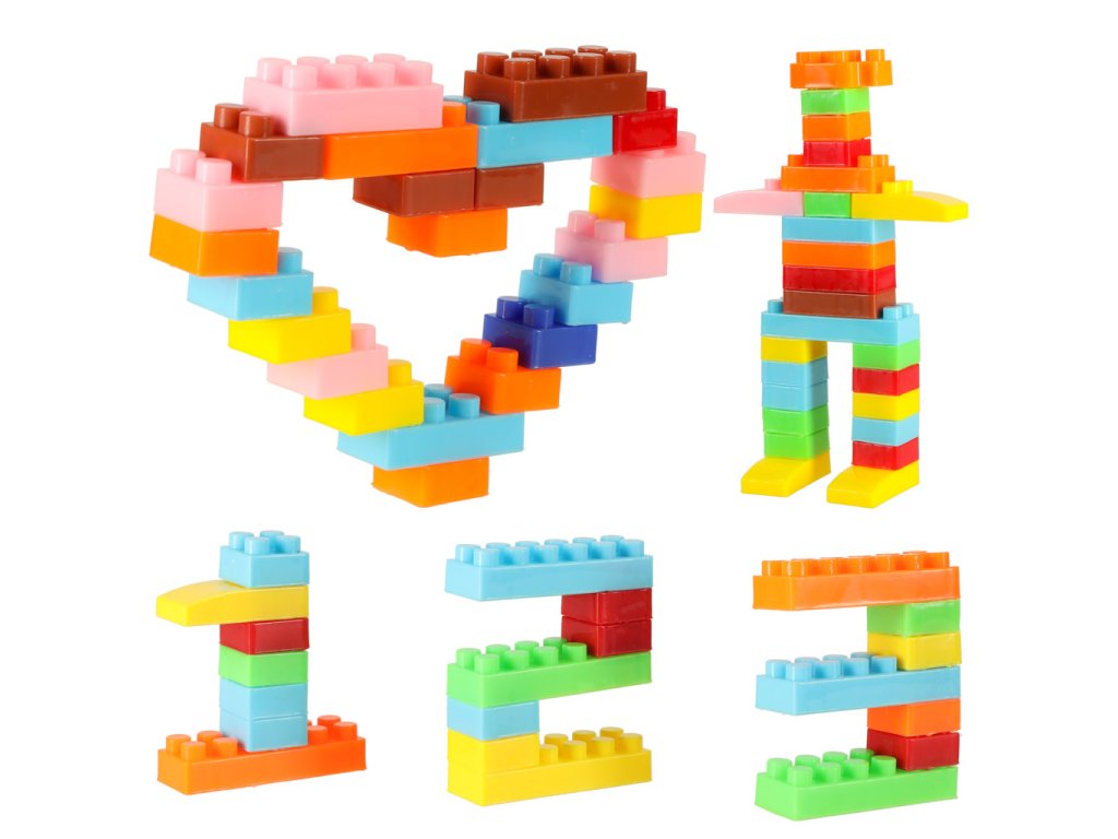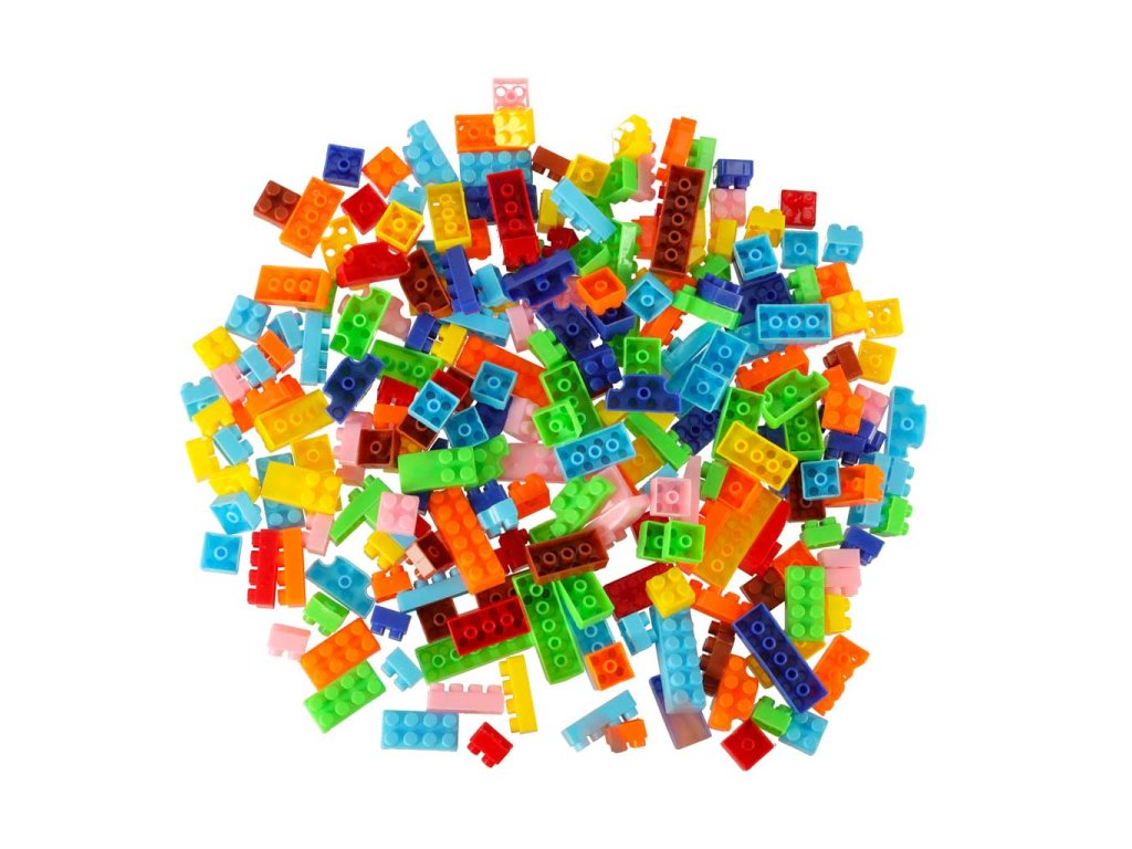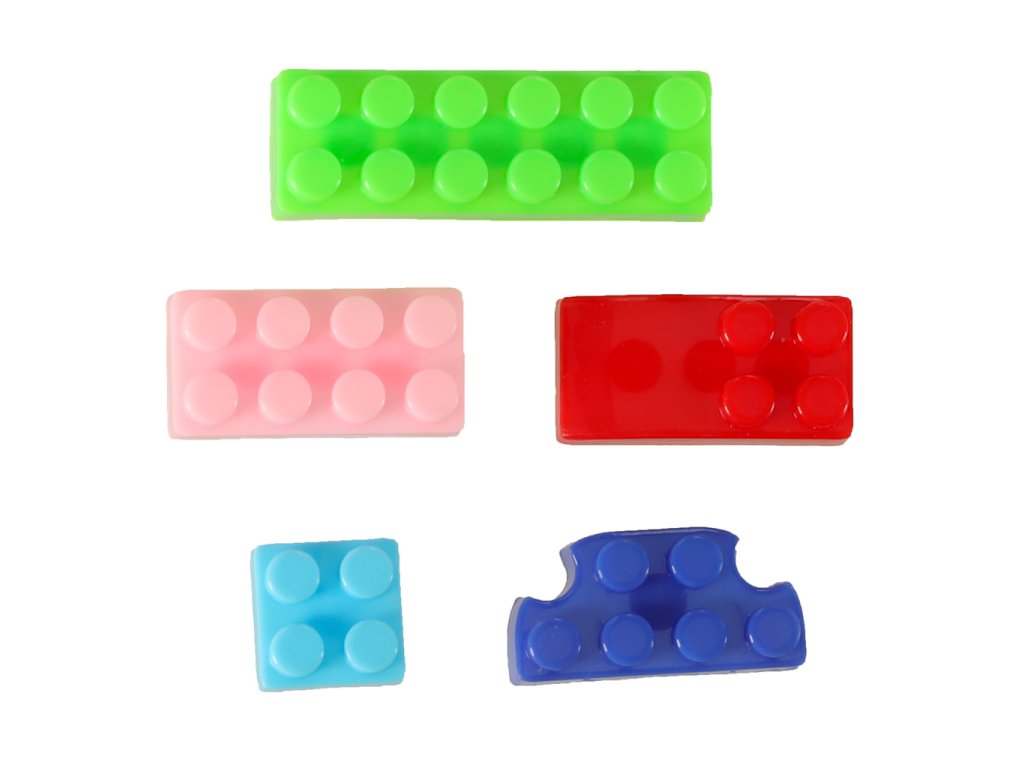 Sada barevných, různě tvarovaných plastových kostek.