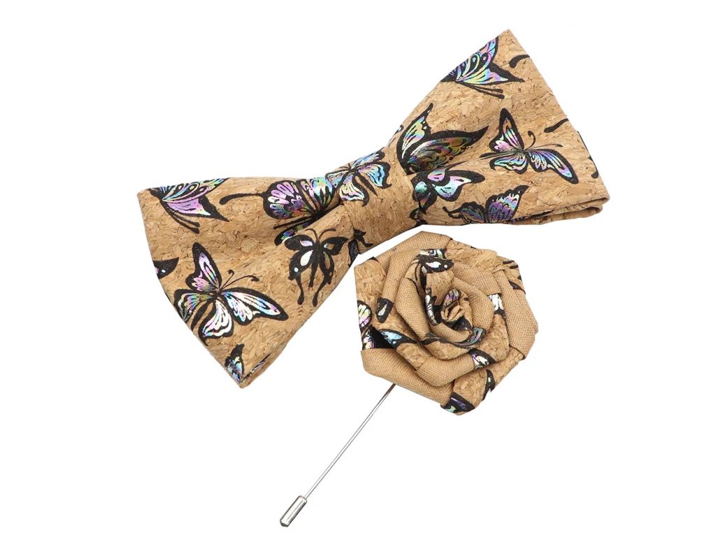 Sada motýlků z korkového dřeva + broží Vintage květinový potisk