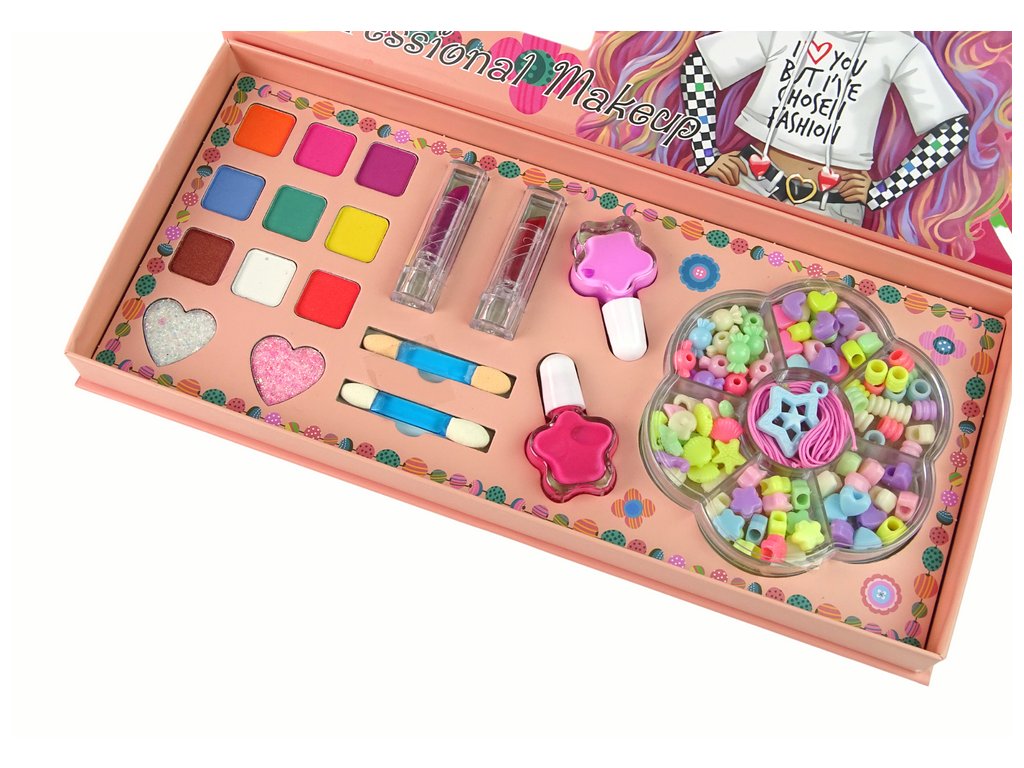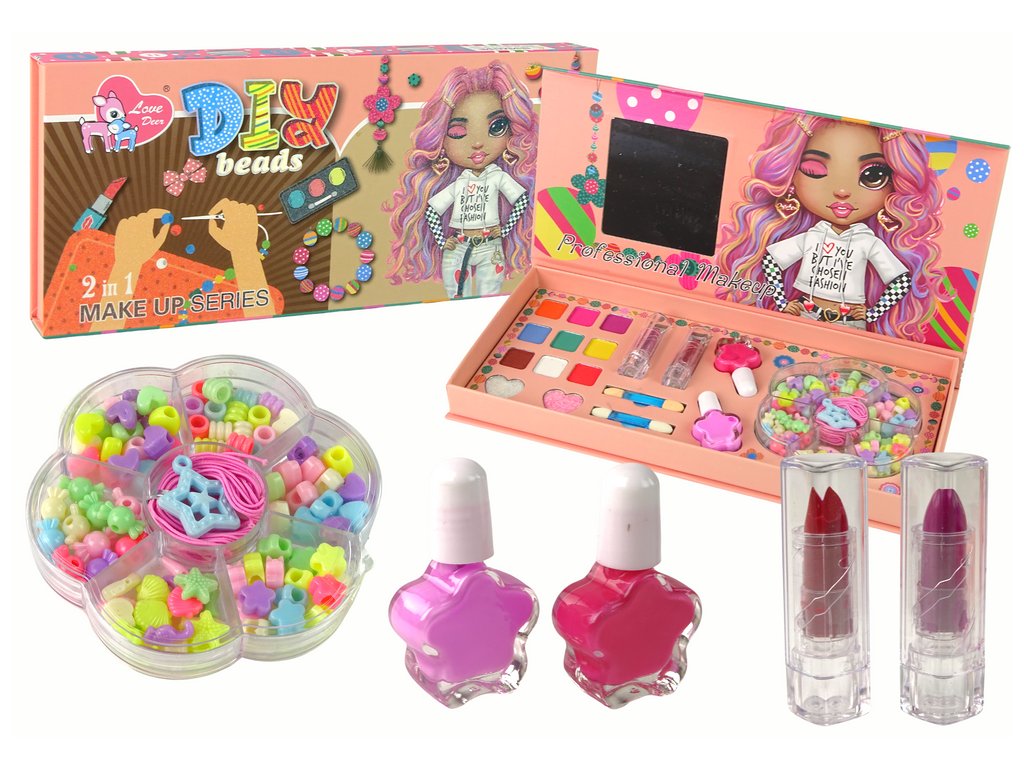 Sada 2v1 na líčení a šperky je perfektní hračkou pro mladé umělce. Tato kreativní sada umožňuje dětem projevit svou fantazii jak tvorbou líčení, tak i navrhováním vlastních šperků. Sada obsahuje až 9 různých barev očních stínů a 2 s třpytivým efektem, 2 rtěnky v různých odstínech, 2 palety očních stínů a 2 růžové laky na nehty.