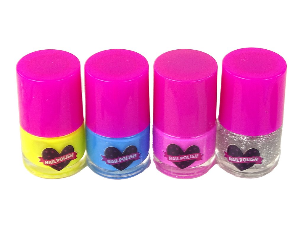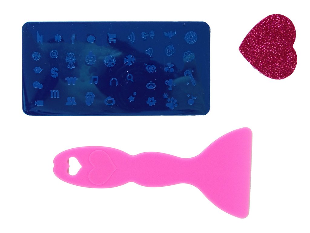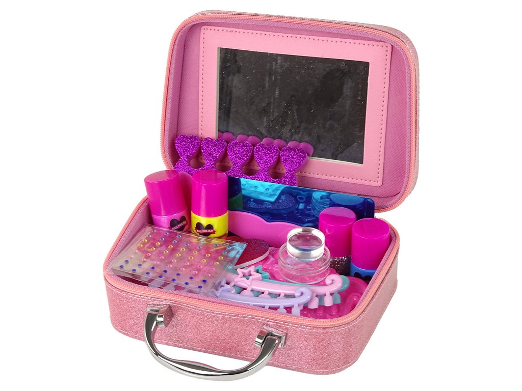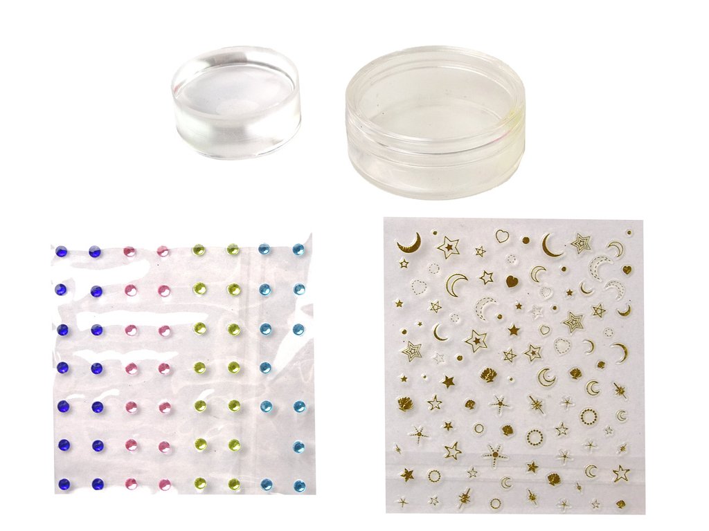 Uvnitř se nachází bohatá sada příslušenství pro kreativní hraní a experimentování s vzhledem. Děti zde najdou 4 různobarevné laky na nehty, kosmetický oddělovač, pilník, talíř se vzory, špachtli, 3 šablony s tipy a samolepkami k nim, razítko, nádobku, samolepky a krystaly.