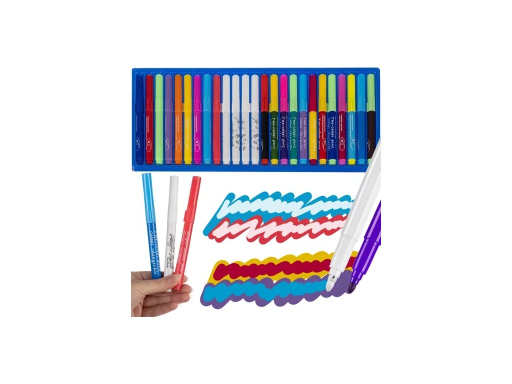 - Sada obsahuje dva druhy per. 12 fixů, které změní barvu, když na ně namalujete bílou fixou, např. žlutá na modrou, a 9 barev, které změní odstín barvy z tmavé na světlou, když jsou vystaveny bílému inkoustu