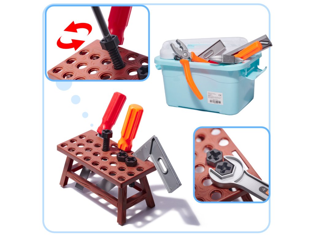 NÁŘADÍ PRO DĚTI DÍLNA S NÁŘADÍM 48EL.Láká vaše dítě pomáhat při renovaci? Nebo si stále hraje na utahování šroubů? Od nynějška budou mít vlastní sadu, se kterou mohou aktivně manipulovat!Sada obsahuje spoustu příslušenství, které jim pomůže s veškerou kutilskou zábavou. Děti se také naučí základům kutilství a bezpečnému zacházení s různými nástroji. A kdo ví, třeba se v nich rozvine vášeň na dlouhá léta dopředu!Nářadí je pestře barevné a připomíná skutečné, aby podpořilo aktivní hru dětí, která jistě nebude mít konce!Sledování a napodobování dospělých je pro malé děti velmi důležité. Nářadí na hraní je tedy skvělým způsobem, jak uspokojit dětskou zvědavost, když rodiče používají skutečné nářadí.Hra se sadou je skvělá pro rozvoj manuální zručnosti dětí. Každý nástroj vyžaduje jiný pohyb těla. Zatloukání hřebíků, šroubování vrutů, řezání dřeva - to vše se dá zvládnout!Rozvíjí kreativní myšlení a podněcuje představivost. Může také podnítit děti k vytváření věcí s myšlenkou DIY (udělej si sám). Se sadou nářadí roztáhne křídla každý malý vynálezce!Sada podporuje různé herní scénáře. Malá renovace domu? Co třeba vlastní dílna, kam za vámi chodí zákazníci? Oprava spotřebičů? Jediným omezením je vaše představivost - kutilství a opravy podle vašich představ! Všechny nástroje v sadě byly navrženy speciálně pro nejmenší, a jsou proto pro ně zcela bezpečné!Každý kus je vyroben z vysoce kvalitního plastu, takže stejně jako skutečné nástroje vydrží dlouho! Sada je ideální jako dárek pro každého malého kutila, který sní o tom, že se stane kutilem, nebo rád pomáhá při opravách v domácnosti. Skvělá volba pro malé inženýry! Technické specifikace: Počet kusů: 48 Materiál: plast Věk dítěte: 3+Rozměry: Kombinátory: 15 cm x 6 cm x 1 cm Kladivo: 15,5 cm x 8,5 cm x 2,5 cm Šroubovák: 13 cm x 10 cm x 4 cm Šroubovák: 5 cm x 1 cm Podstavec s otvory: 16 cm x 8,5 cm x 8 cm Balení: 24,5 cm x 18,5 cm x 13,5 cmVýrobek je zabalen v atraktivní p
