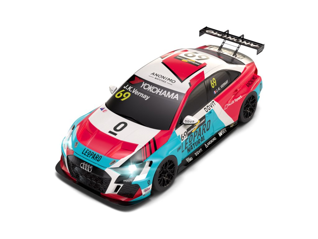 Dráhové autíčko SCX Advance Audi RS3 LMS TCR Bostik v měřítku 1:32, s osvětlením pro digitální autodráhy SCX Advance. Verze 2.0.