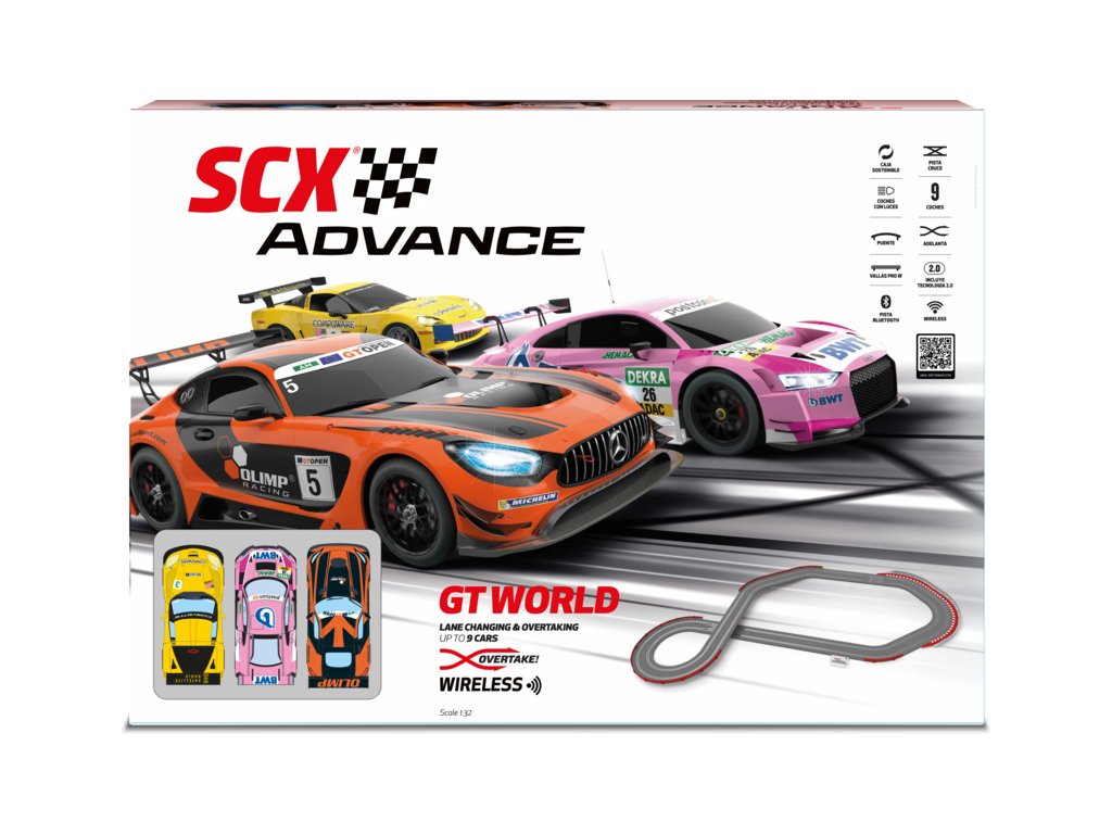 Elektrická závodní autodráha SCX Advance GT World 2.0 v klasickém měřítku 1:32 pro napínavější závody - vynikající digitální autodráha s možností předjížděním v křížení (ovladačem řízená výhybka), Bluetooth rovinkou pro počítání kol v aplikaci, mostem svodidly a krajnicí s mantinely. Balení obsahuje tři bezdrátové ovladače s přepínačem výhybky, tři detailně zpracovaná digitální dráhová autíčka SCX Audi R8 LMS GT3, Mercedes AMG GT3 a Chevrolet Corvette C6R, která jsou vybavena LED světly. Součástí je také exkluzivně Bluetooth rovinka pro napínavé závody. Plocha pro rozložení: 252 x180 cm. Složení tratě je velmi snadné, jednotlivé traťové díly zacvaknete do sebe, spárujete ovladače s autíčky a můžete začít závodit.