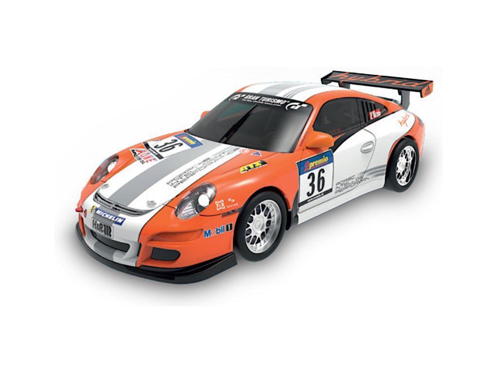 Dráhové autíčko SCX Advance Porsche 911 GT3 Hybrid v měřítku 1:32, verze 2.0, pro digitální autodráhy SCX Advance. Autíčko je vybaveno LED osvětlením. Na podvozku se nachází přepínač digital / analog - autíčko lze tedy používat na digitální autodráze SCX Advance i na analogové autodráze SCX Original.