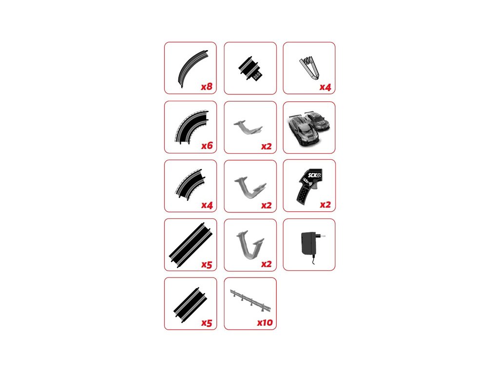 Balení obsahuje traťové díly, most, svodidla, dvojitý looping, 2x dráhové autíčko, 2x ovladač a napájecí zdroj.