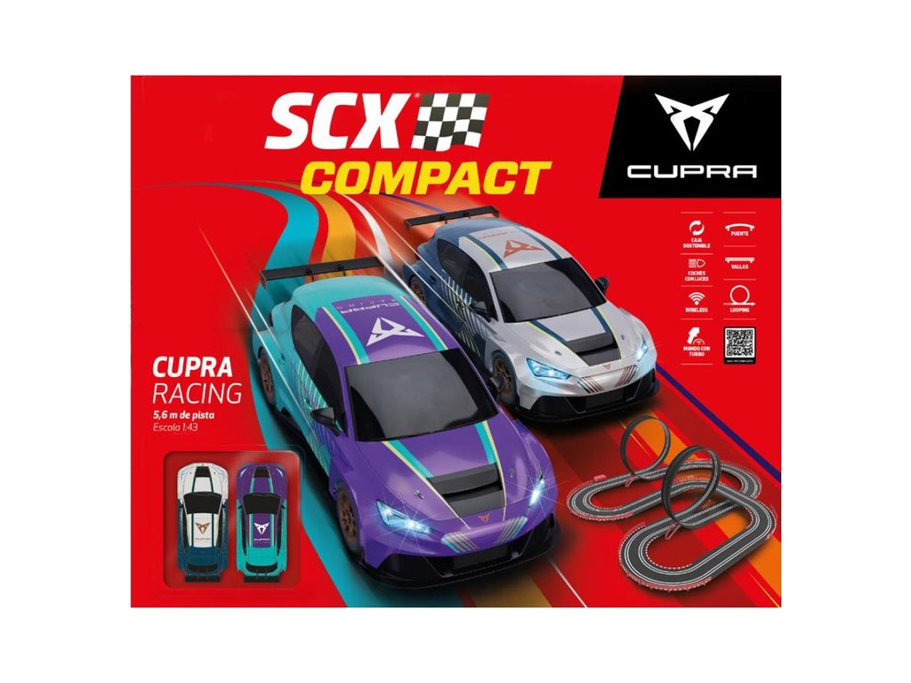 Autodráha SCX Compact Cupra Racing v měřítku 1:43 - analogová elektrická autodráha s rovinkami, zatáčkami, mostem, svodidly, barevnými obrubníky a dvojitým loopingem. Dva bezdrátové ovladače, dvě detailní dráhová autíčka Seat Cupra se světly. Plocha pro rozložení základní varianty: 114 x 107 cm. Délka tratě: 5,6 m. Složení tratě je velmi snadné, jednotlivé traťové díly zacvaknete do sebe, připojíte ovladače a můžete začít závodit.
