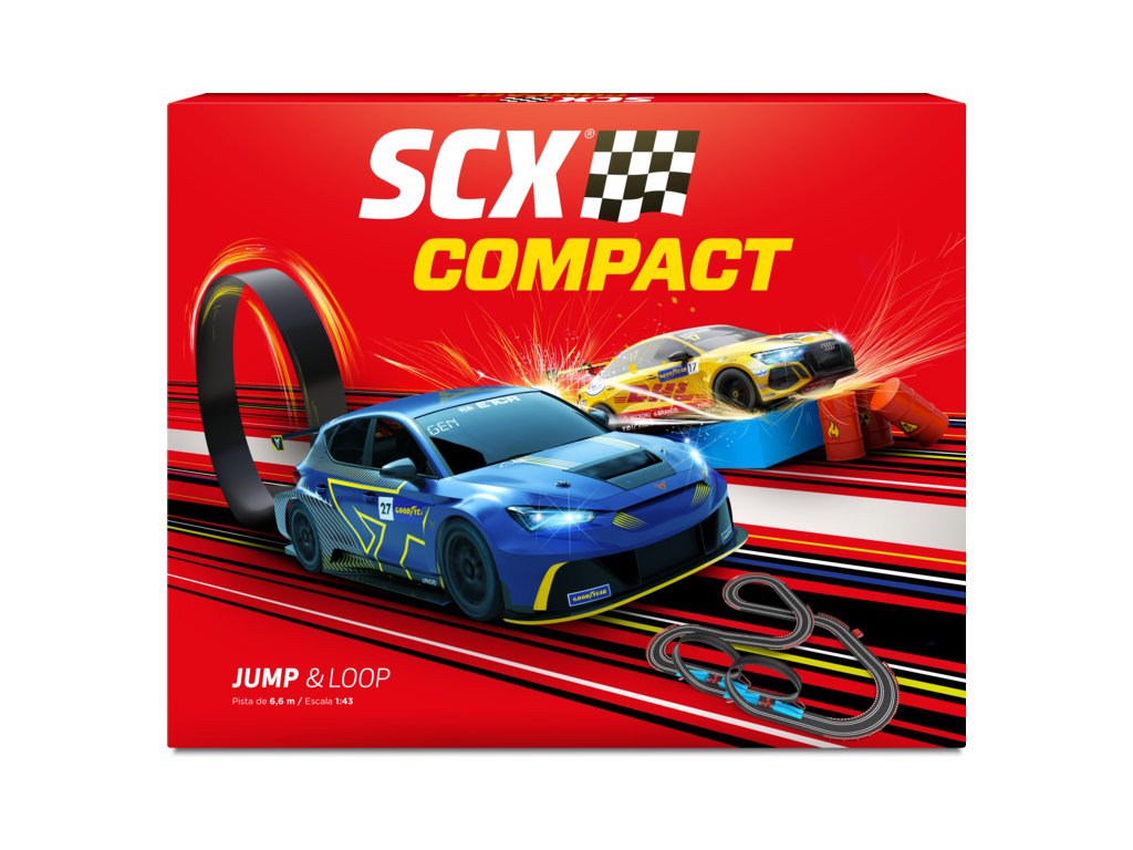 Autodráha SCX Compact Jump & Loop v měřítku 1:43 - analogová elektrická autodráha s rovinkami, zatáčkami, mostem, svodidly, barevnými obrubníky, dvojitým loopingem a skokánky s barely. Dva bezdrátové ovladače, dvě detailní dráhová autíčka se světly, Cupra E-Racer Tambay a Audi RS3 LMS TCR Berthon. Plocha pro rozložení základní varianty: 156 x 123 cm. Délka tratě: 6,6 m. Složení tratě je velmi snadné, jednotlivé traťové díly zacvaknete do sebe, připojíte ovladače a můžete začít závodit.