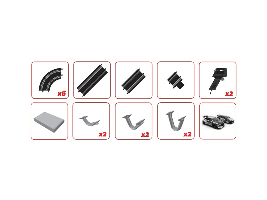Balení obsahuje traťové díly, most, 2x dráhové autíčko, 2x ovladač a box pro baterie.