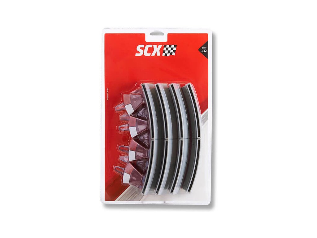 Krajnice s mantinelem pro vnitřní oblouk (zatáčku) autodráhy SCX 1:32. Balení obsahuje 4 kompletní sady.