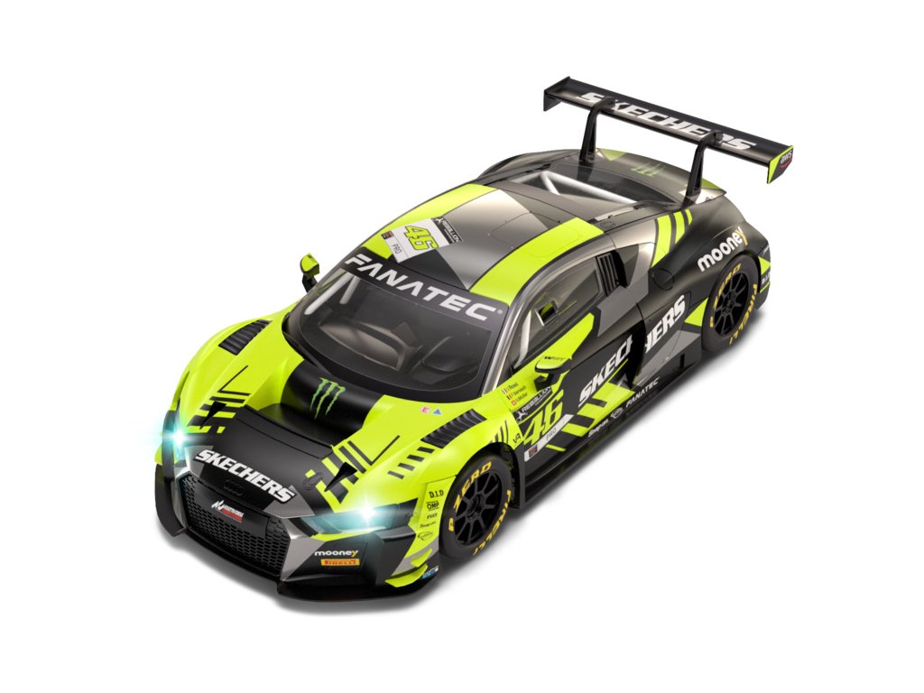 Dráhové autíčko SCX Original Audi R8 LMS VR46 v měřítku 1:32, s osvětlením, pro analogové autodráhy SCX Original. Pokud doplníte SCX Advance Konverzní sada typ A - dlouhý SCXE10405X200, můžete auto použít pro autodráhu Advance.
