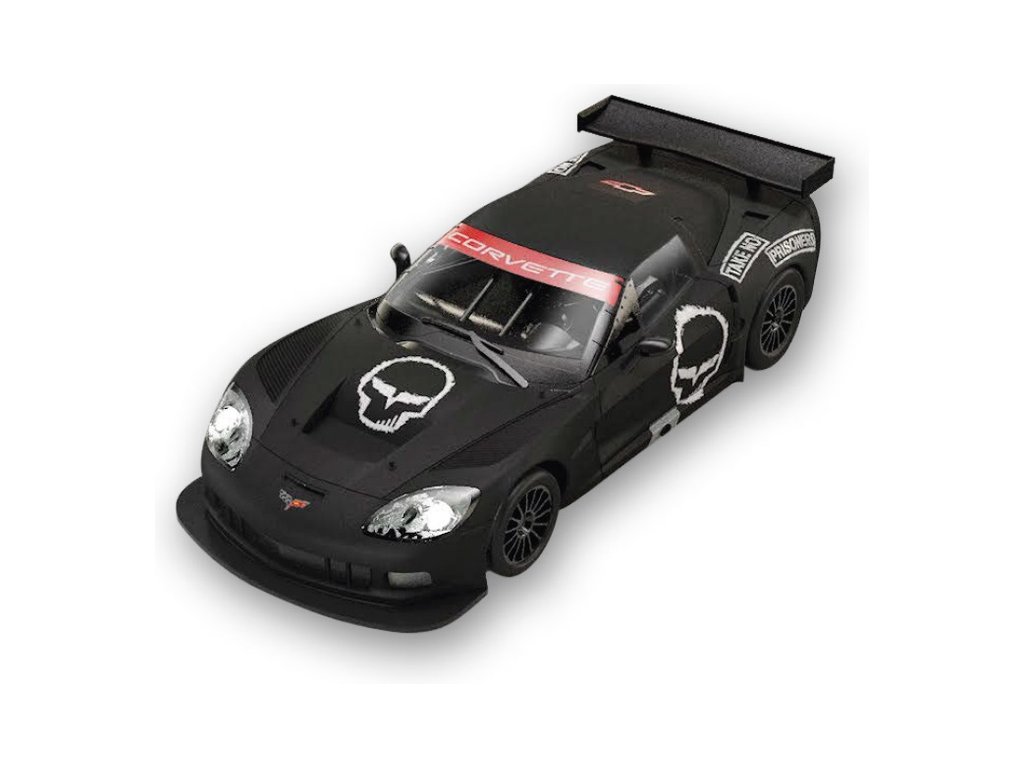 Dráhové autíčko SCX Original Corvette C6R Skull v měřítku 1:32, pro analogové autodráhy SCX Original. Autíčko je vybaveno LED světly.