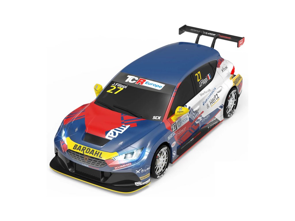 Dráhové autíčko SCX Original Cupra Leon Competition J. Filippi v měřítku 1:32, s osvětlením, pro analogové autodráhy SCX Original. Pokud doplníte SCX Advance Konverzní sada typ A - dlouhý SCXE10405X200, můžete auto použít pro autodráhu Advance.