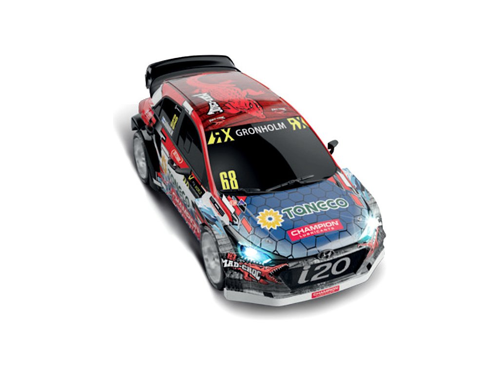Dráhové autíčko SCX Original Hyundai i-20 Gronholm v měřítku 1:32, s osvětlením, pro analogové autodráhy SCX Original. Pokud doplníte SCX Advance Konverzní sada typ A - dlouhý SCXE10405X200, můžete auto použít pro autodráhu Advance.