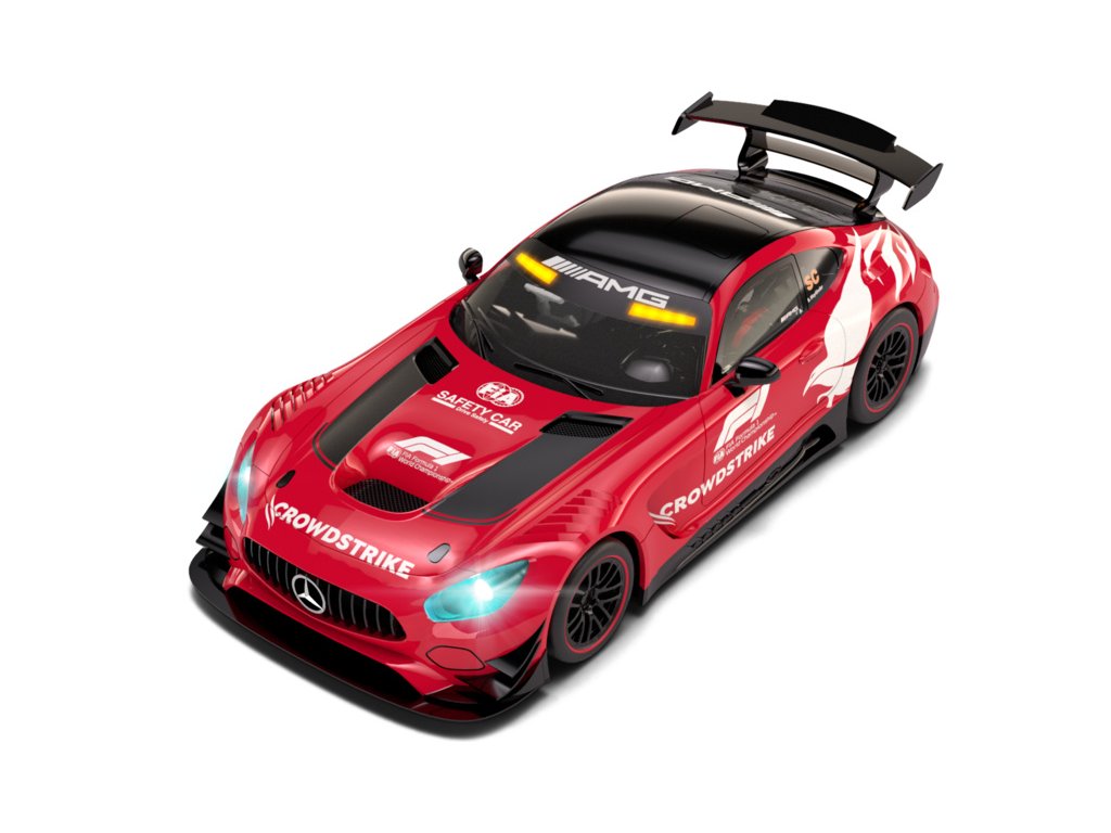 Dráhové autíčko SCX Original Mercedes AMG GT3 Safety v měřítku 1:32, s osvětlením, pro analogové autodráhy SCX Original. Pokud doplníte SCX Advance Konverzní sada typ A - dlouhý SCXE10405X200, můžete auto použít pro autodráhu Advance.