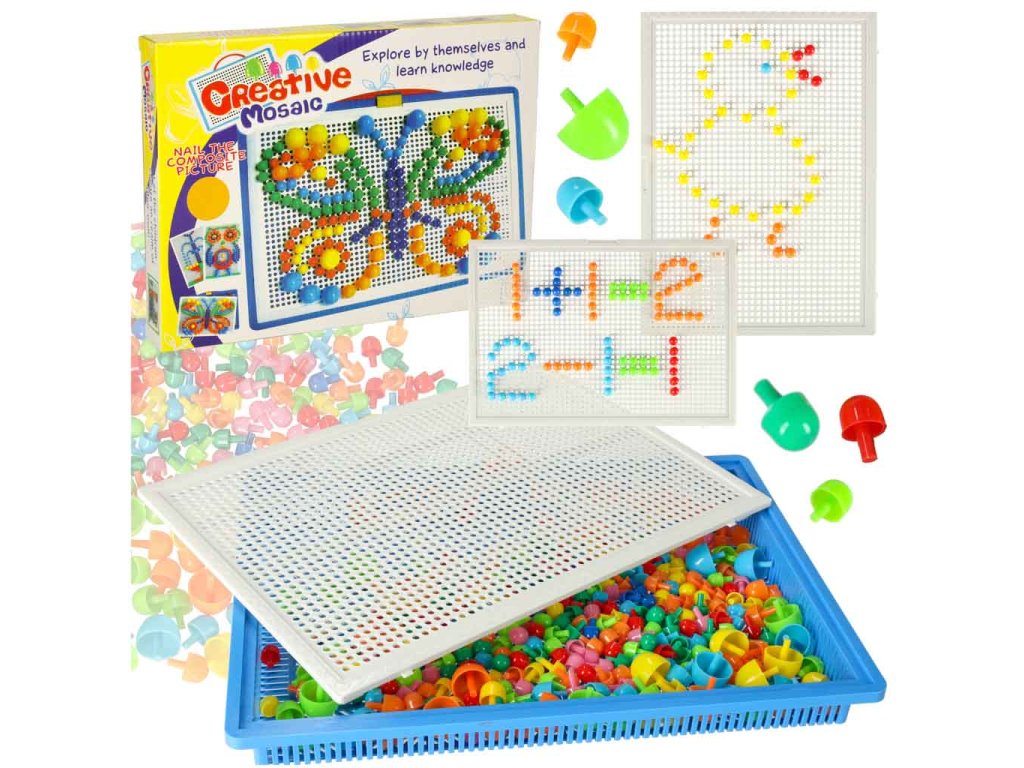 Jednoduchá hračka, která obsahuje barevné plastové špendlíky různých velikostí a perforovanou destičku na jejich připínání.