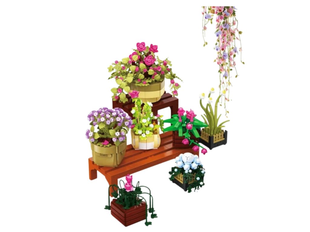 Sada obsahuje 1446 pečlivě vyrobených dílků, ze kterých si můžete vytvořit bohaté aranžmá – různé květiny v úhledných květináčích (včetně růží, cymbidií, mini orchidejí, fuchsií a cibulovin) jsou umístěny na třípatrové policové konstrukci, což celkovému vzhledu dodává eleganci a řád. Po sestavení má hotové aranžmá rozměry 44 x 42 x 24,5 cm a lze jej vystavit na polici, stole, komodě nebo vitríně.