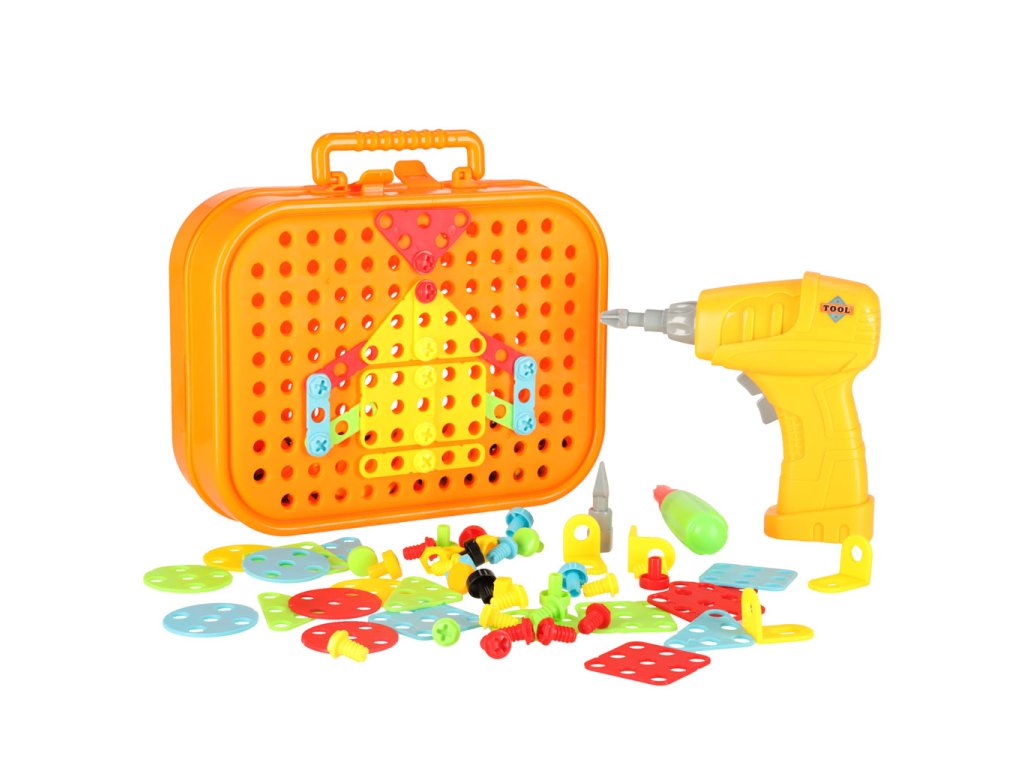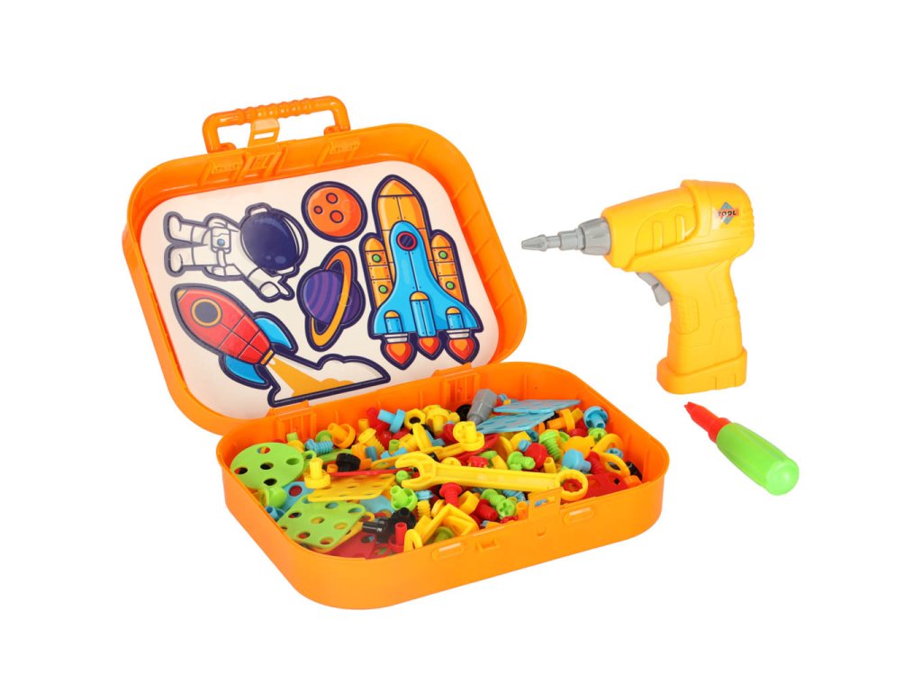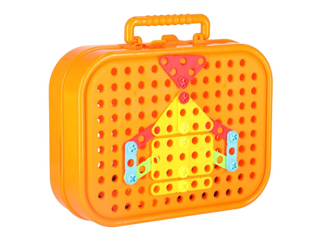 Praktický plastový kufřík slouží jako úložný prostor pro všechny dílky a zároveň jako herní deska, do které děti pomocí barevných šroubků a bloků tvoří vlastní vesmírné stavby.