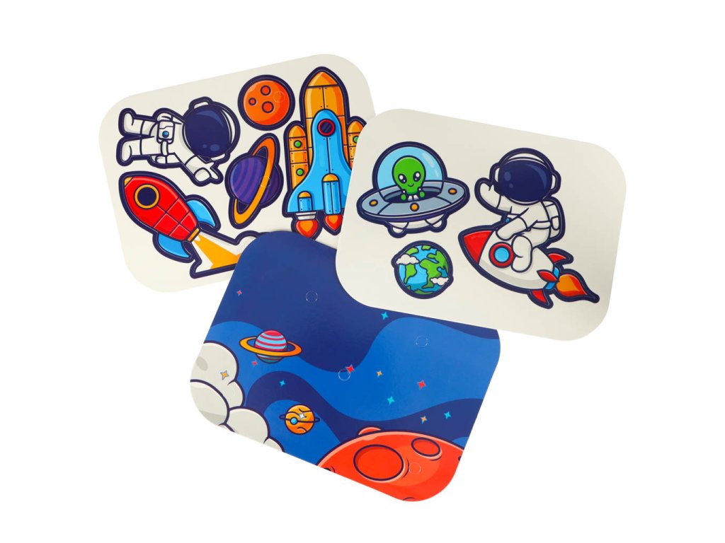 Součástí jsou také kartonové doplňky s vesmírnou tématikou – rakety, planety a astronauti, díky nimž si děti vytvoří originální 3D výtvory z dalekého kosmu.