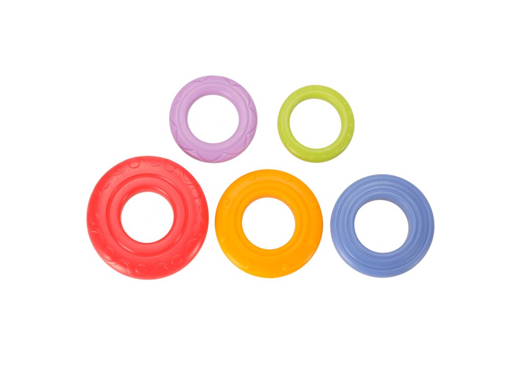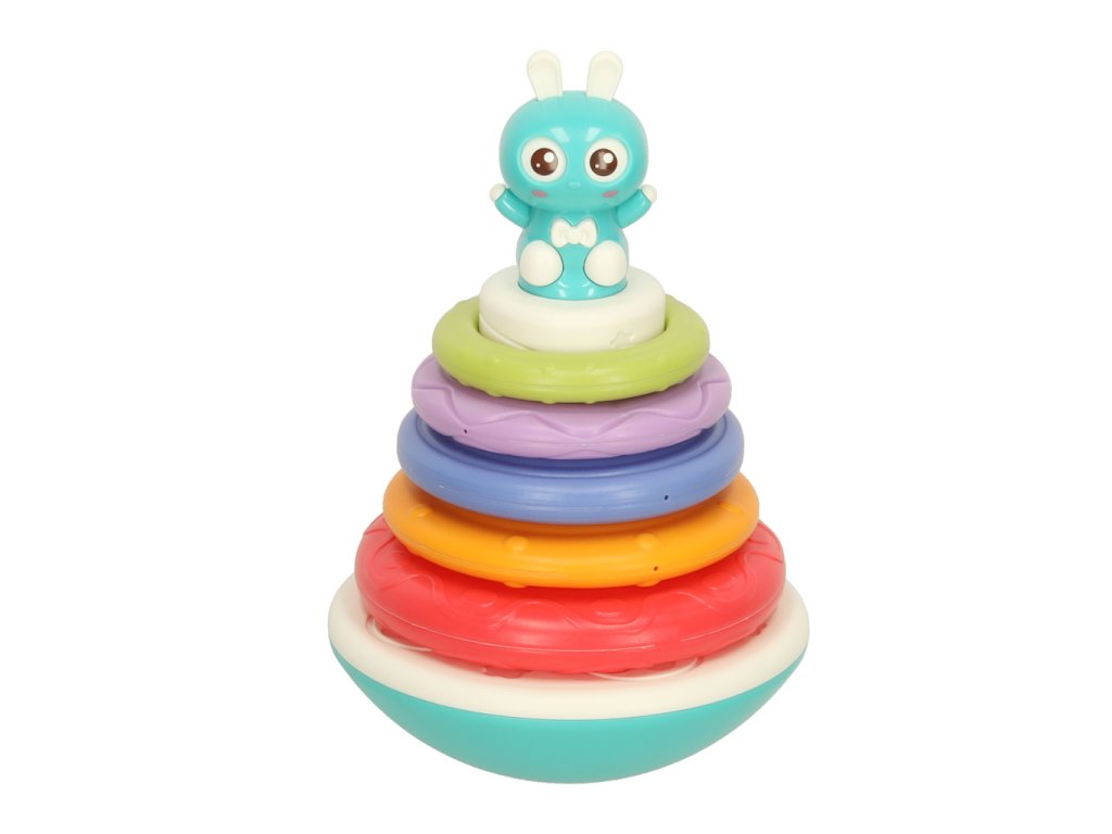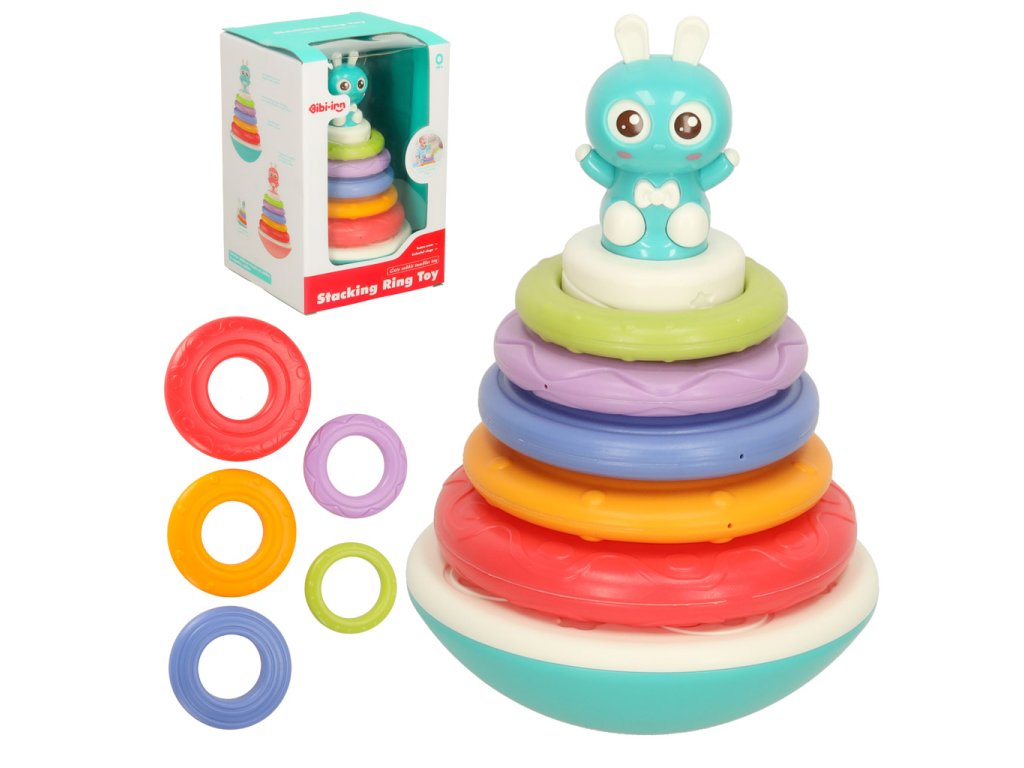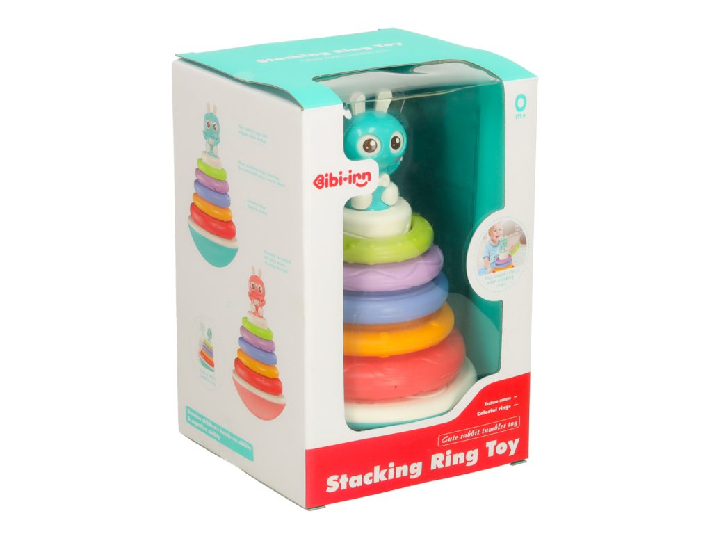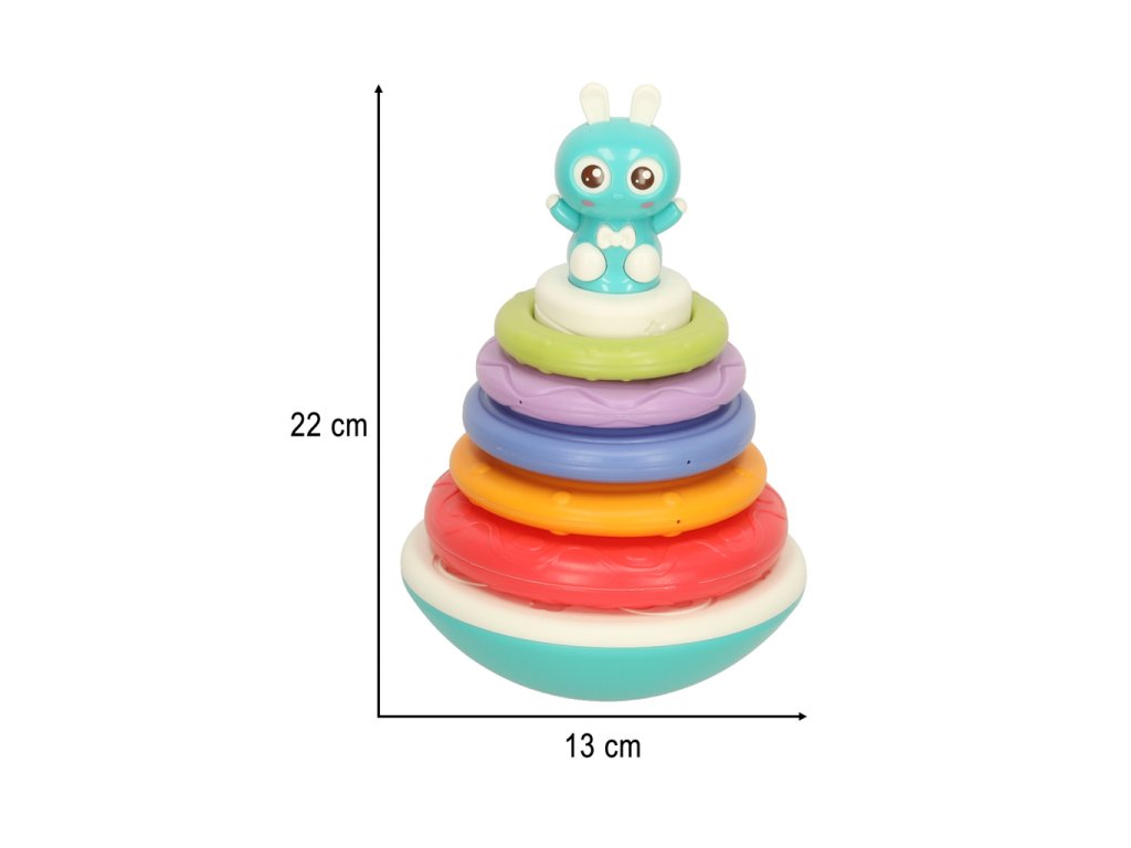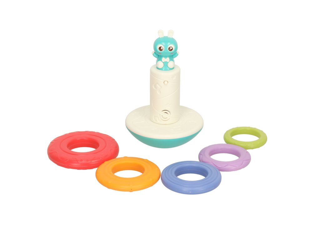 Věž s kroužky je interaktivní senzorická hračka určená pro nejmenší děti. Sada obsahuje barevný podstavec a pět kroužků různých velikostí a barev, které se umisťují do věže. Každý umístěný kroužek aktivuje jeden z osmi zvuků, což zvyšuje herní zapojení. Produkt podporuje rozvoj drobné motoriky, koordinace ruka-oko a zrakového a sluchového vnímání. K provozu jsou potřeba 2 baterie AAA (nejsou součástí sady).