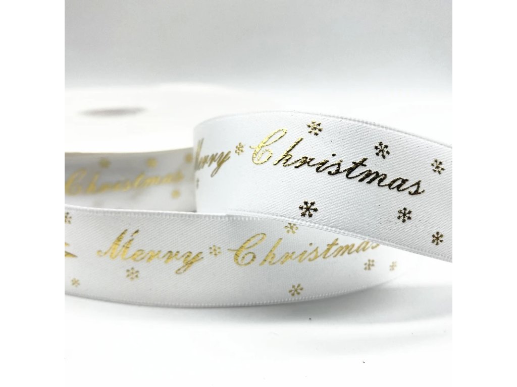 Stuha s potiskem (bílá se zlatým nápisem Merry Christmas) 4,5m