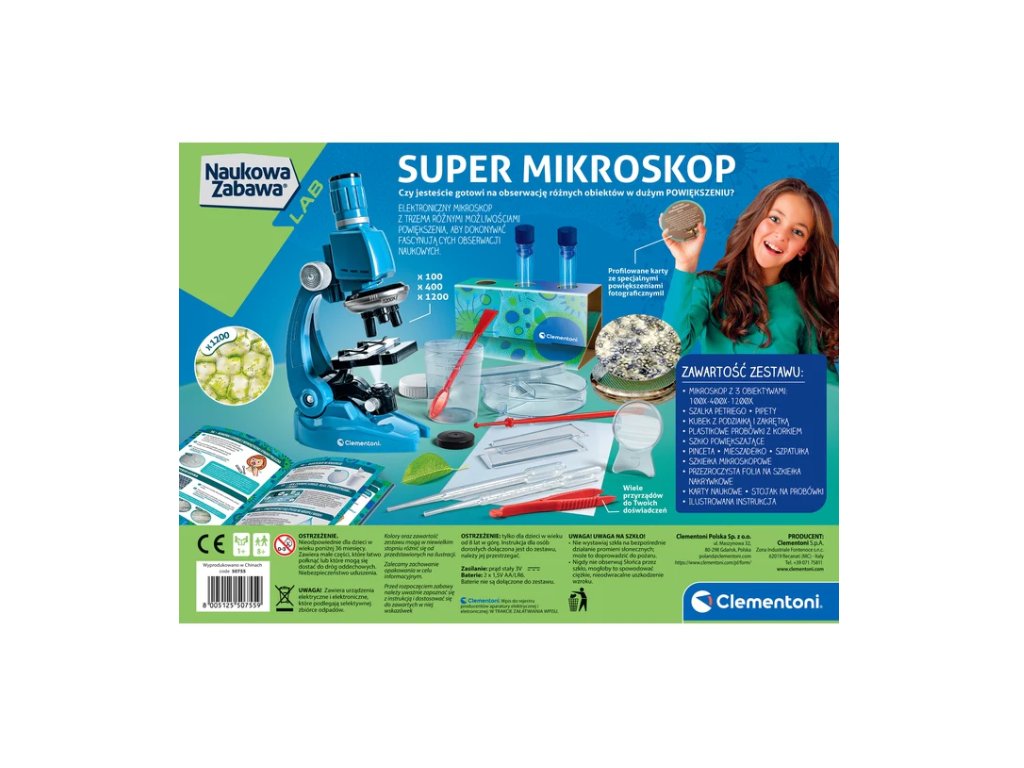 Objevte fascinující svět mikrobiologie s výukovým mikroskopem Clementoni! Tento moderní mikroskop byl navržen speciálně pro mladé vědce, kteří chtějí prozkoumávat tajemství přírody a rozvíjet své badatelské vášně. Je vybaven vícenásobným zvětšením a umožňuje pozorovat detaily, které nejsou pouhým okem viditelné – od struktury listů, přes minerální částice až po mikroskopické organismy.