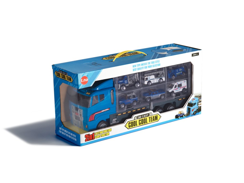 Velký policejní tahač s autíčky – sada kovových vozidel v transportéru